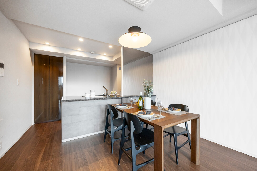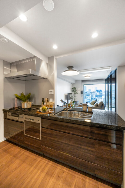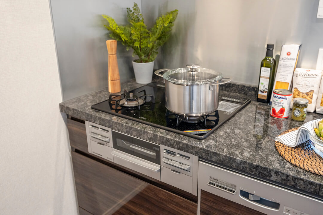 キッチンは、リビングダイニングを見渡しながら料理ができる対面式です。家族や来客とのコミュニケーションが取りやすくて◎。しかし、コンロ側には壁がたっているので、油跳ねなどの心配はありません。