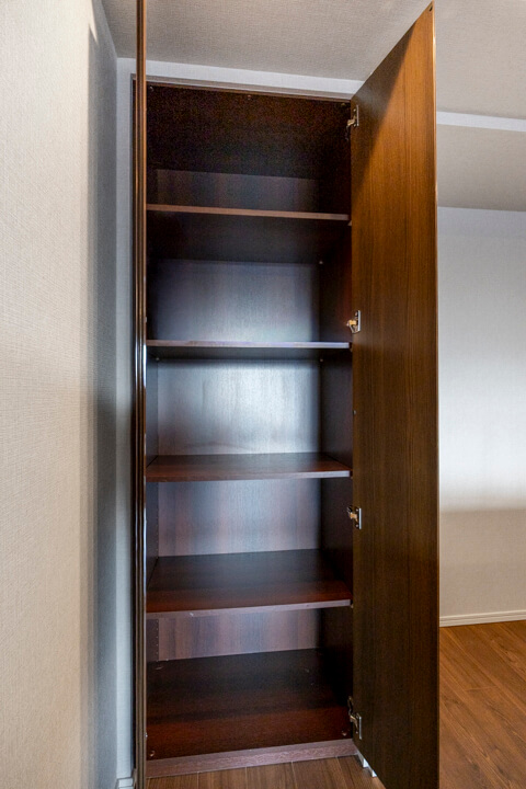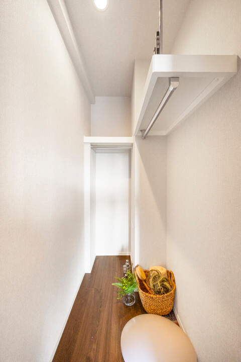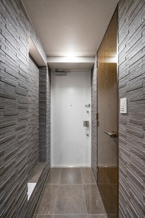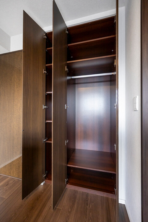 モダンな雰囲気が漂う玄関にはシューズインクローゼットが造られています。中には棚が設置されており、たくさんの靴が収納できそうですよ。また、照明には人感センサーが付いているので、帰宅時に両手が塞がっていても安心です。消し忘れも防止できて節電にもなりますね。