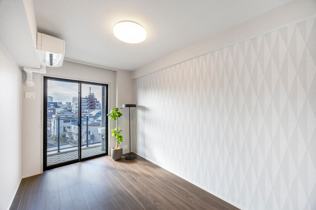 約7.0帖のゆとりがある寝室は、主寝室に良さそうなお部屋です。大きめのベッドも配置できそうで◎。南西向きの窓からはバルコニーにアクセスできますよ。また、奥行きのあるウォークインクローゼットが付いています。洋服や大きめの荷物が収納できて便利です。