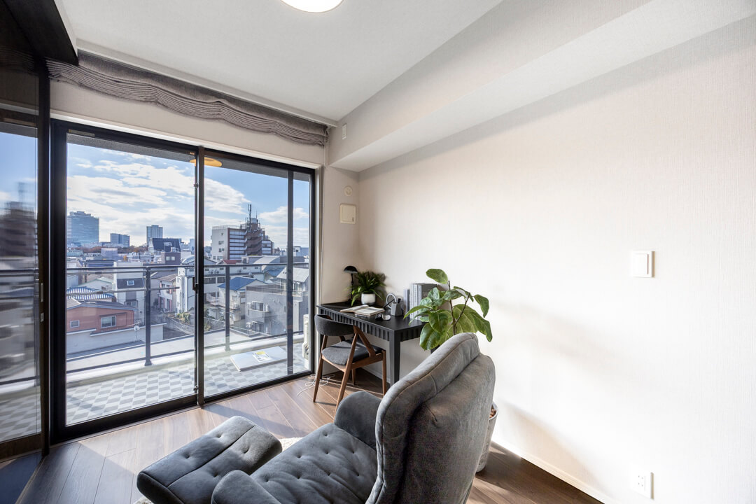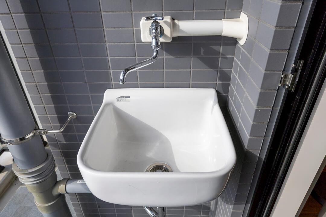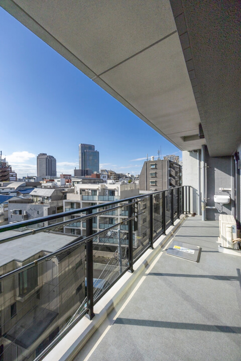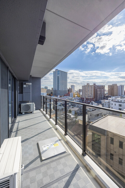 約14.12㎡のゆったりとしたバルコニーです。チェアなどを置いて気分転換にも◎。さらに、南西向きのため日当たりが良好で、目の前には抜け感のある眺望が広がっています。プラチナ通りのイチョウも望めて四季を感じることができそうですよ。また、スロップシンク付きで靴などを洗うのにも便利。