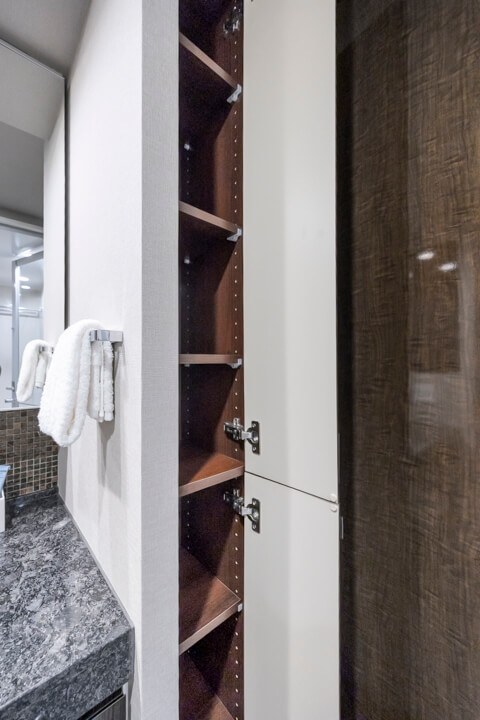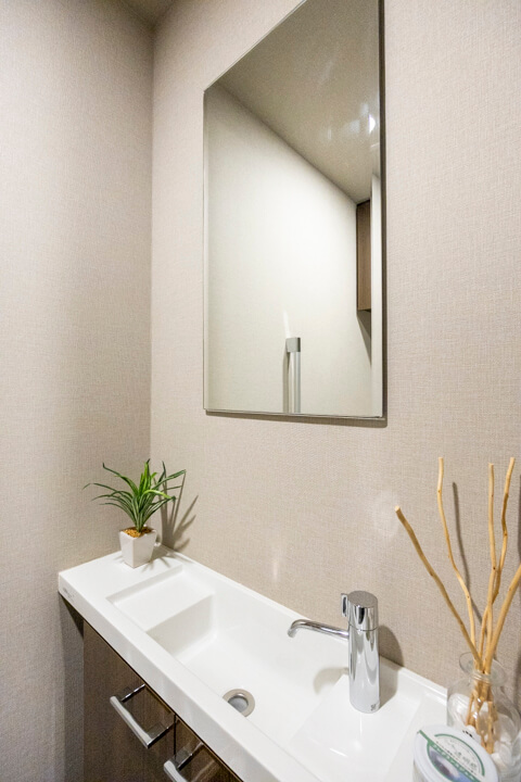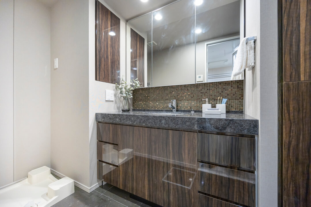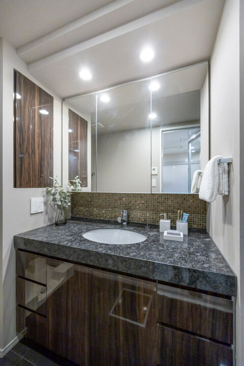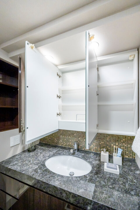 石目調のカウンターやモザイクタイルで重厚感のある洗面化粧台です。三面鏡の中には化粧品などが収納できて使い勝手良好。さらに、壁面や横にも棚が造られているので、ごちゃごちゃしがちな洗面まわりもきちんと整頓できそうですよ。