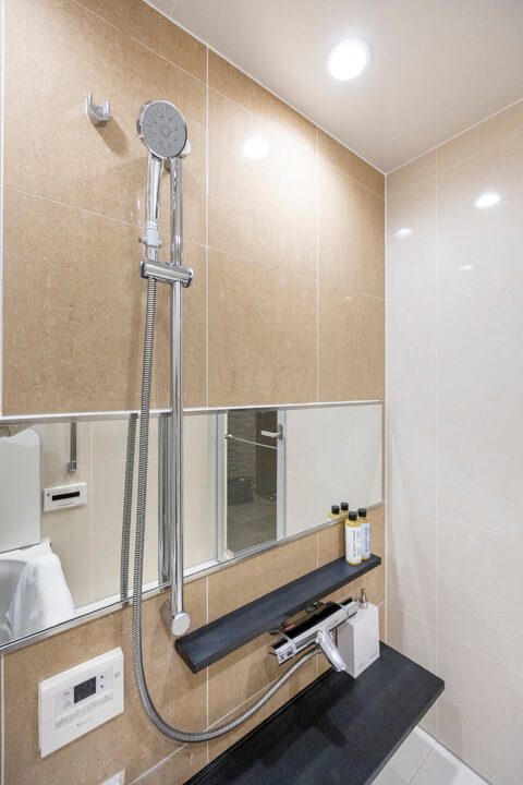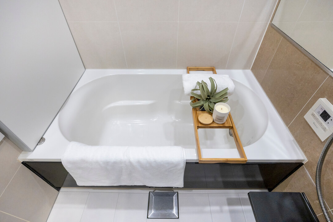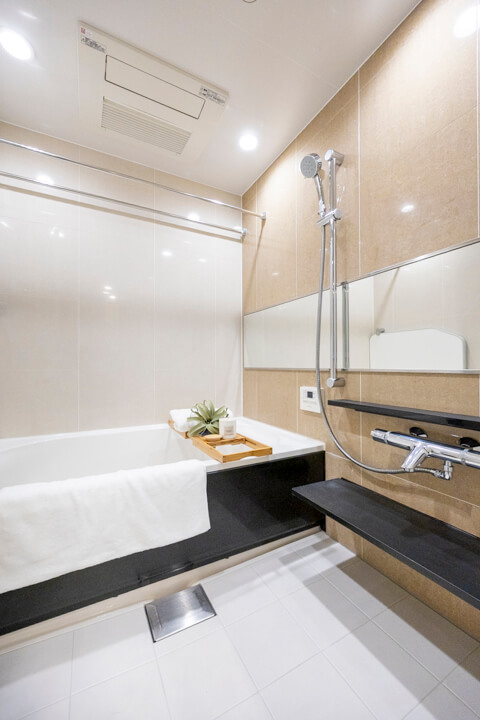 ブラックがアクセントになっているバスルームです。お風呂にゆっくり浸かるのが好きという方に嬉しい追い焚き機能を搭載。家族の入浴時間がずれてしまっても安心です。また、浴室乾燥機には暖房・乾燥・換気・ミストサウナの機能がついており、一年中快適に過ごすことができます。