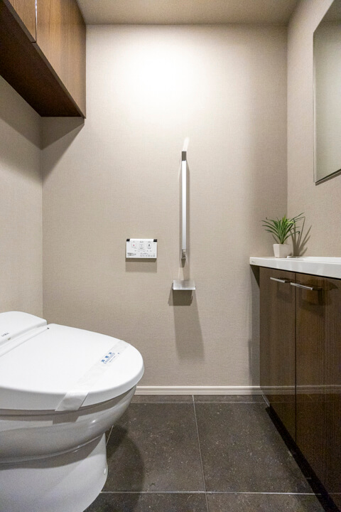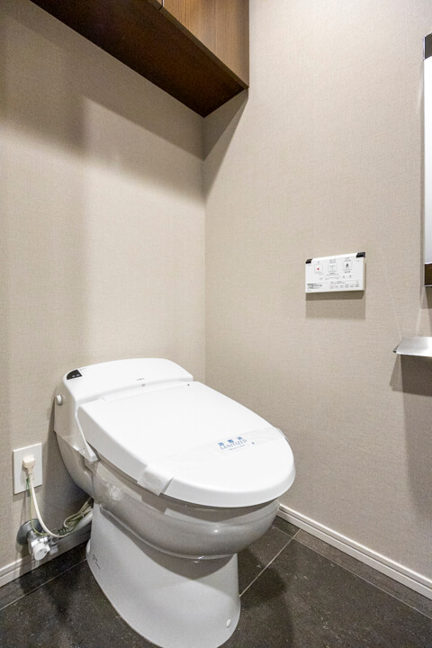 ウォシュレット一体型のトイレです。タンクレスタイプなのですっきりとした印象に。また、別途で手洗い器と鏡が造られているので、その場でサッと身だしなみを整えることができます。上部には吊戸棚が設置されていて、収納スペースもありますよ。