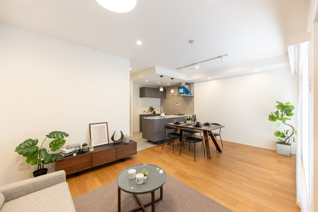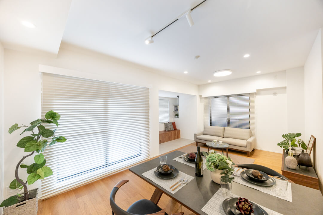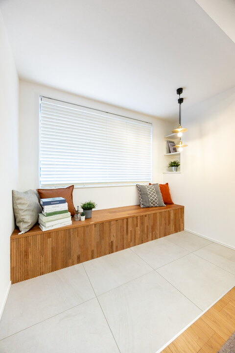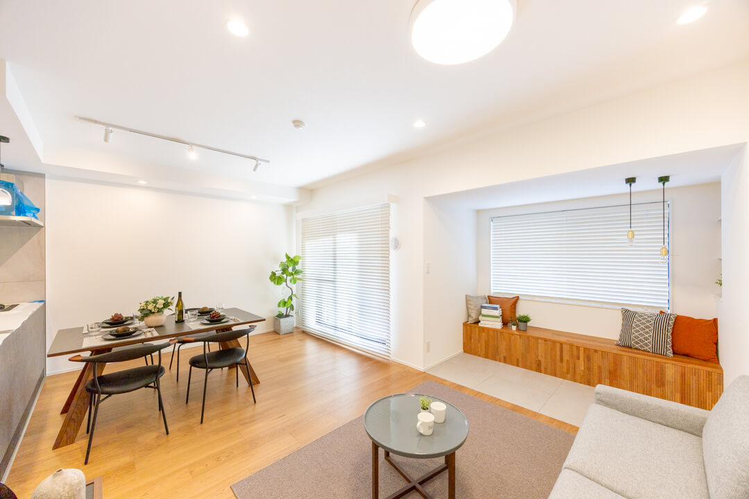 約18.9帖の広々としたリビングダイニングキッチンです。二面採光で南東向きのため日当たりが良好。窓側にはベンチが設置されており、読書など気分転換にもぴったりな空間となっています。