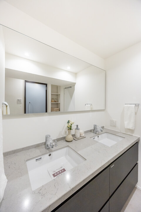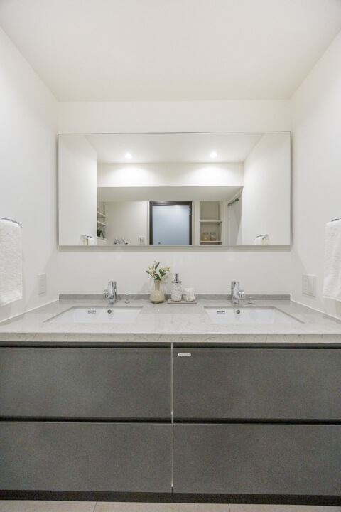 ホテルライクな2ボウル洗面の化粧台です。忙しい朝でも並んで支度ができて使い勝手良好。背面側には可動棚が設置されているので、リネン類や着替えなどを置いておくことができますよ。