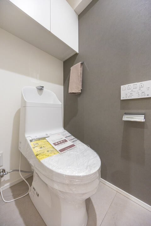 ウォシュレット一体型のトイレです。上部には吊戸棚が設置されているので、トイレットペーパーや掃除用具などを収納することができます。