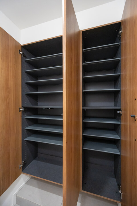 白を基調とした清潔感のある玄関です。背の高いシューズボックスが備え付けられていますが、フロートタイプのため空間に圧迫感を与えません。扉面には鏡が設置されているので、出かける際に全身のコーディネートをチェックできて便利です。また、廊下にも収納棚が2つも造られていますよ。カウンターには小物などを飾っても◎。