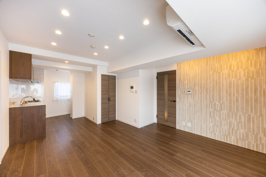 約15.0帖の広々としたリビングダイニングキッチンです。調湿機能と消臭機能を備えたデザイン性の高いエコカラットが使用されています。お部屋のアクセントになる上に調湿消臭効果もあるとは嬉しいですね。また、生活感が出がちな小物を収納できる棚も造られていて◎。
