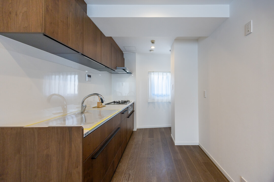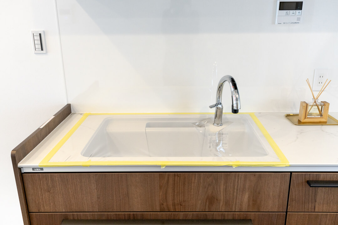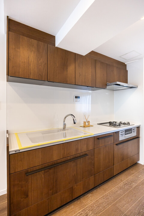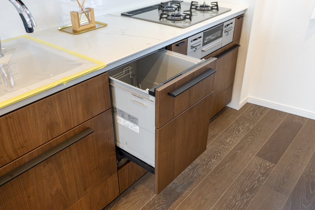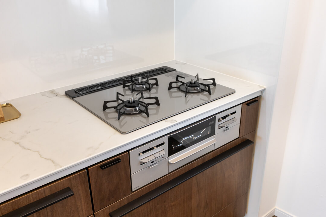 3口コンロ、グリル、食洗機付きと設備面が充実している壁付けキッチンです。シンクも広々としているので野菜などが洗いやすそうですよ。また、作業スペースにはコンセントが付いています。その場でミキサーやコーヒーメーカーなどのキッチン家電を使用することができるので使い勝手良好です。