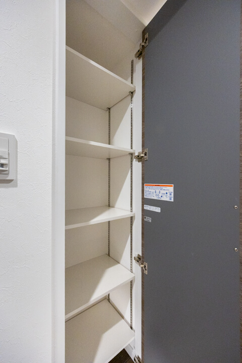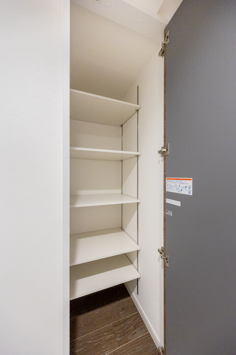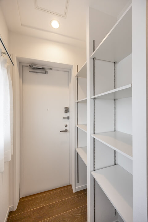 背面側には、玄関外へ直接アクセスできるドアがあります。買い物から帰ってきて、そのまま荷物を持って来ることができる嬉しい動線になっていますよ。可動棚も設置されていて◎。