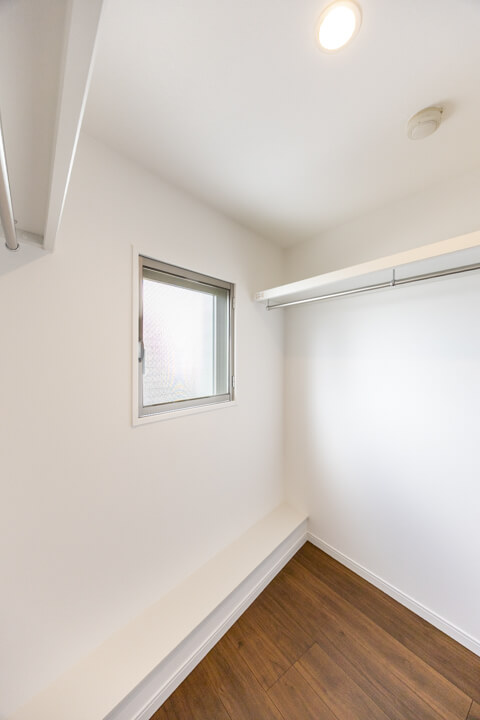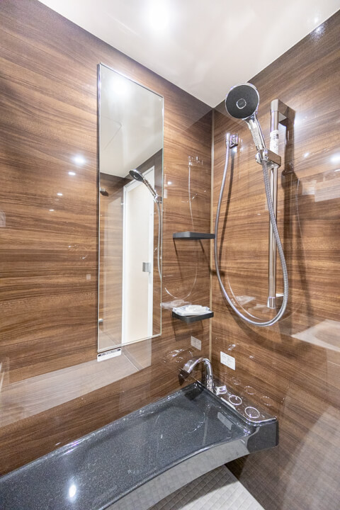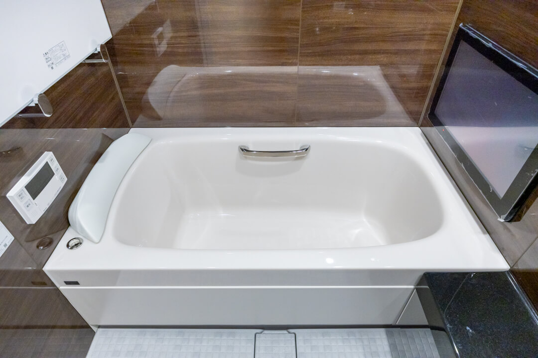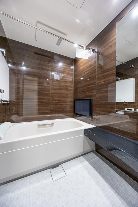ダークブラウンの壁パネルが落ち着いた雰囲気を演出してくれている浴室です。お風呂にゆっくり浸かるのが好きという方に嬉しい追い焚き機能を搭載。家族の入浴時間がずれてしまっても安心です。また、浴室乾燥機が千知されているので、雨の日の洗濯物にも困りません。さらに、浴槽側にテレビが付いているので、毎日のバスタイムがより充実した時間になりそうですよ。ベンチカウンターは半身浴の合間に休憩ができたり、足湯を楽しんだりすることもできますね。