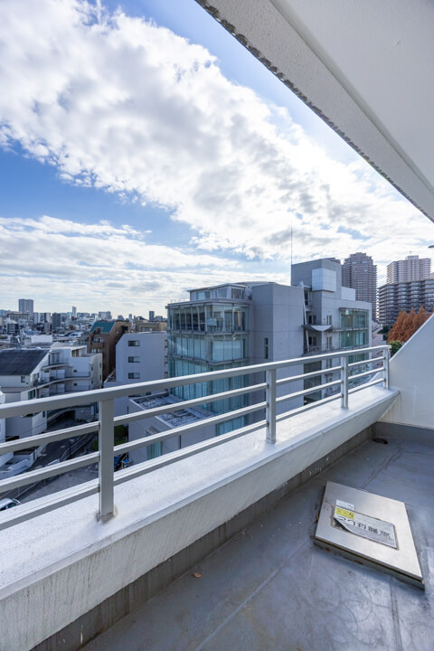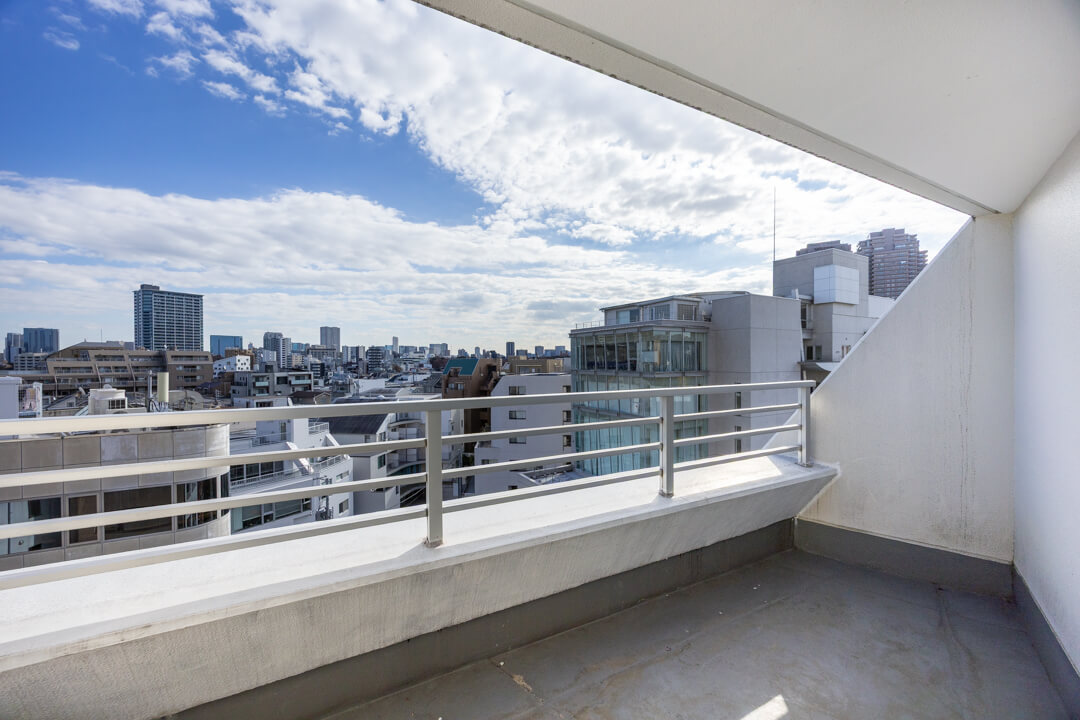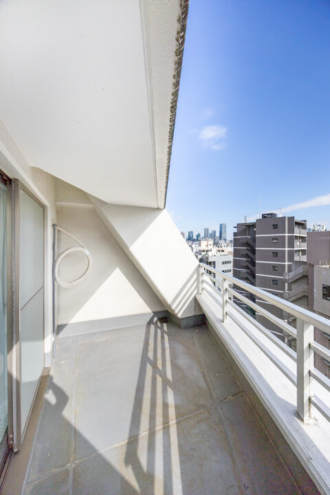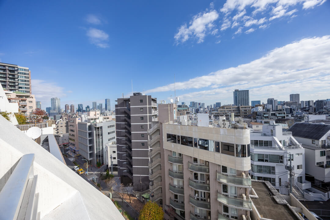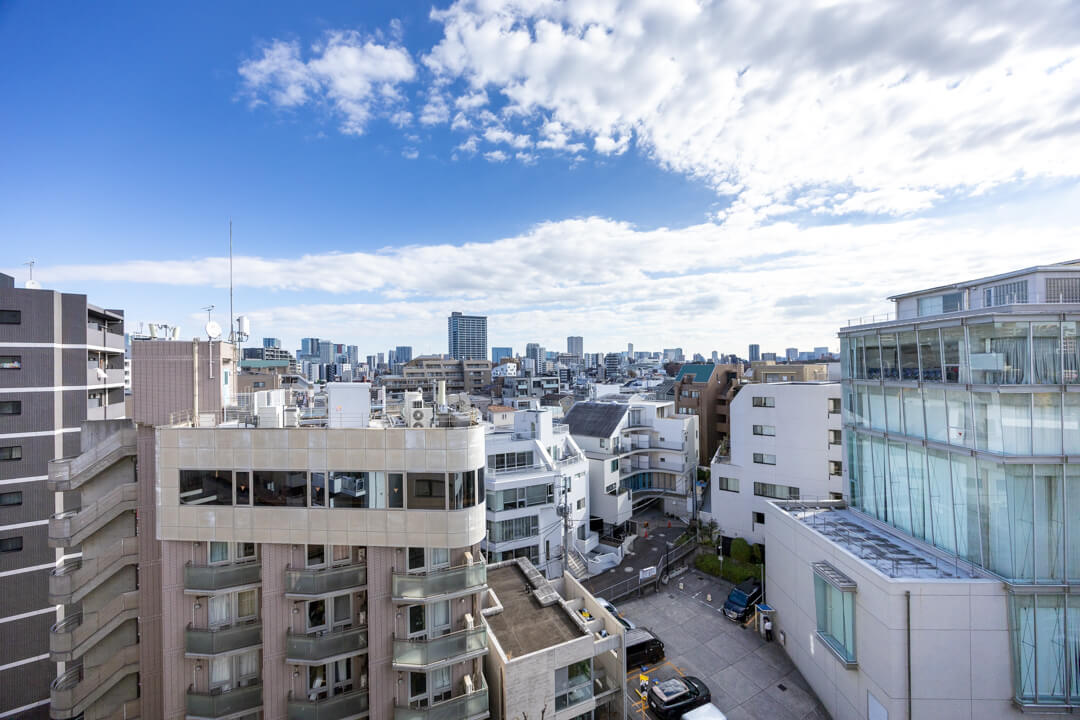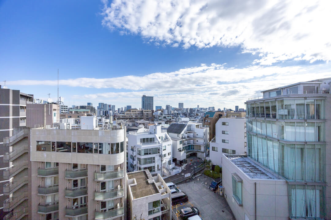 窓からはルーフバルコニーにアクセスができます。東向きのため、午前中から陽が入り、気持ちの良い空間。また、目の前に高い建物がないので、抜け感のある眺望が広がっていますよ。南側を向くと恵比寿ガーデンプレイスも望めます。