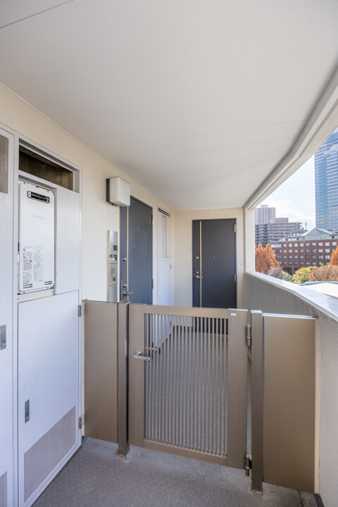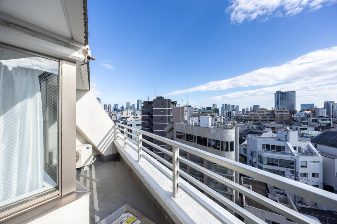 窓からはもう一つのルーフバルコニーにアクセスができます。最上階のため眺望・日当たりが良好!遠くの空には六本木ヒルズや虎ノ門ヒルズなどが望め、夜景も楽しむことができそうですよ。