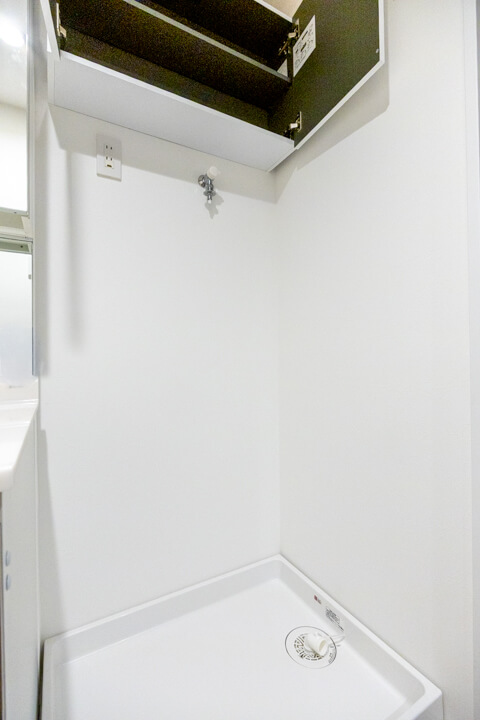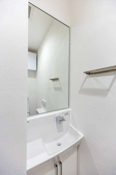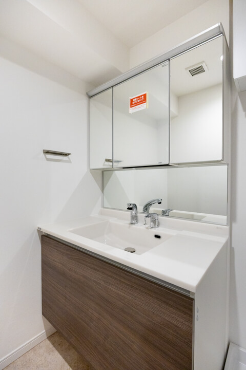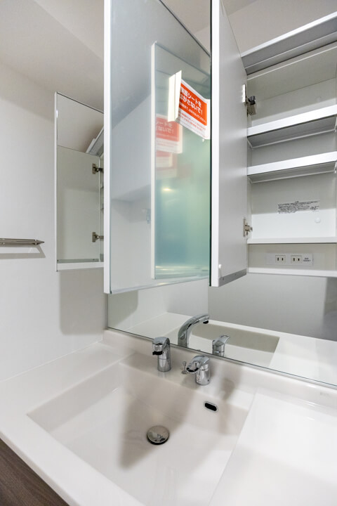三面鏡の中には化粧品などが収納できて使い勝手良好な洗面化粧台です。カウンターと洗面ボウルには継ぎ目がないので、お手入れも簡単。水栓の背面側も鏡になっており、座りながらや背の低いお子さまでも鏡が見やすくなっています。