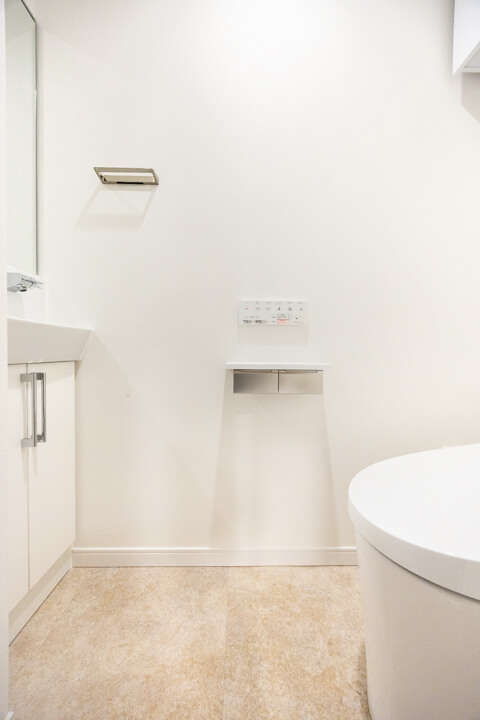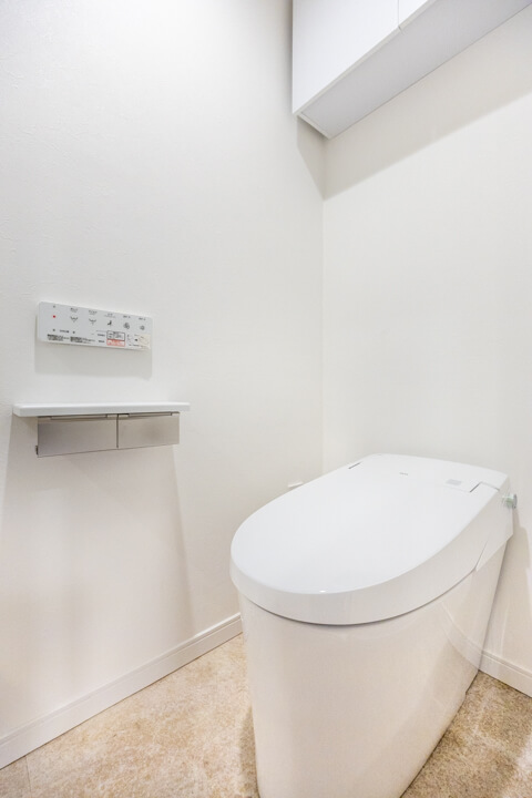 ウォシュレット一体型のトイレです。タンクレスタイプなのですっきりとした印象に。また、別途で手洗い器が造られているので、すぐに手を洗うことができて衛生的です。上部には吊戸棚が設置されていて、収納スペースもありますよ。