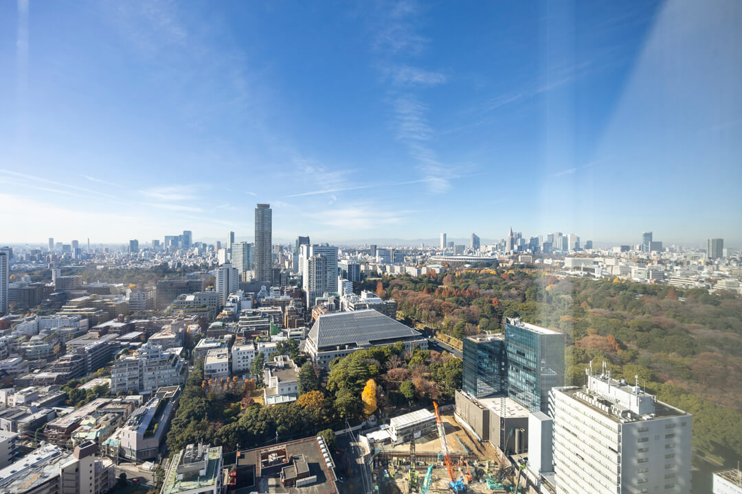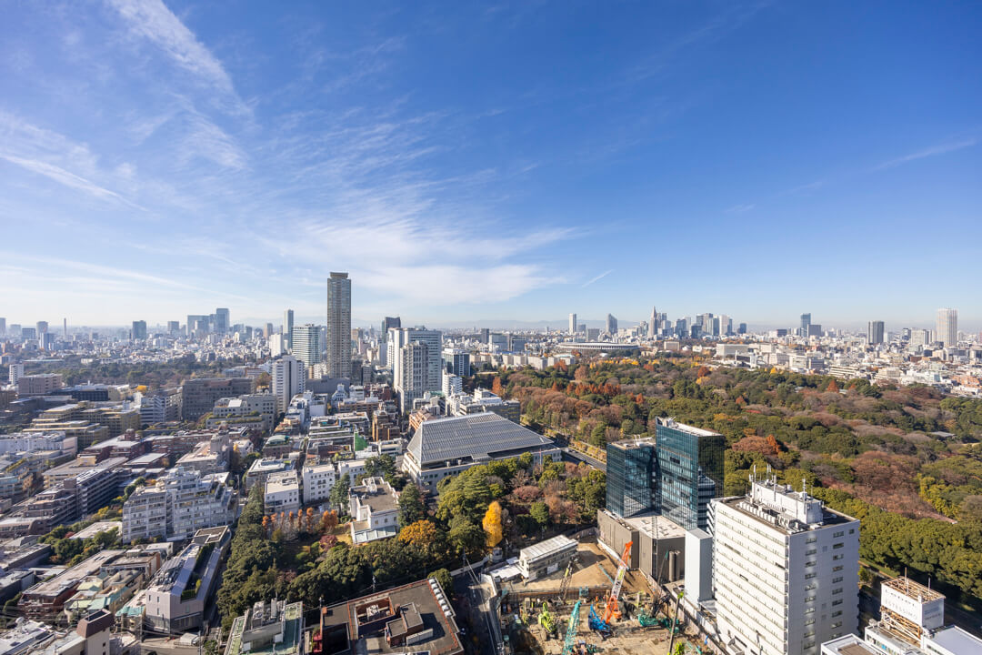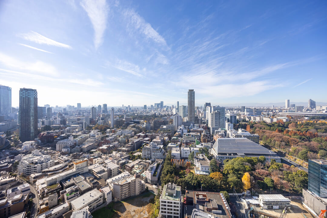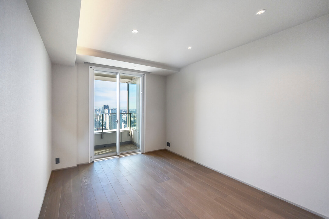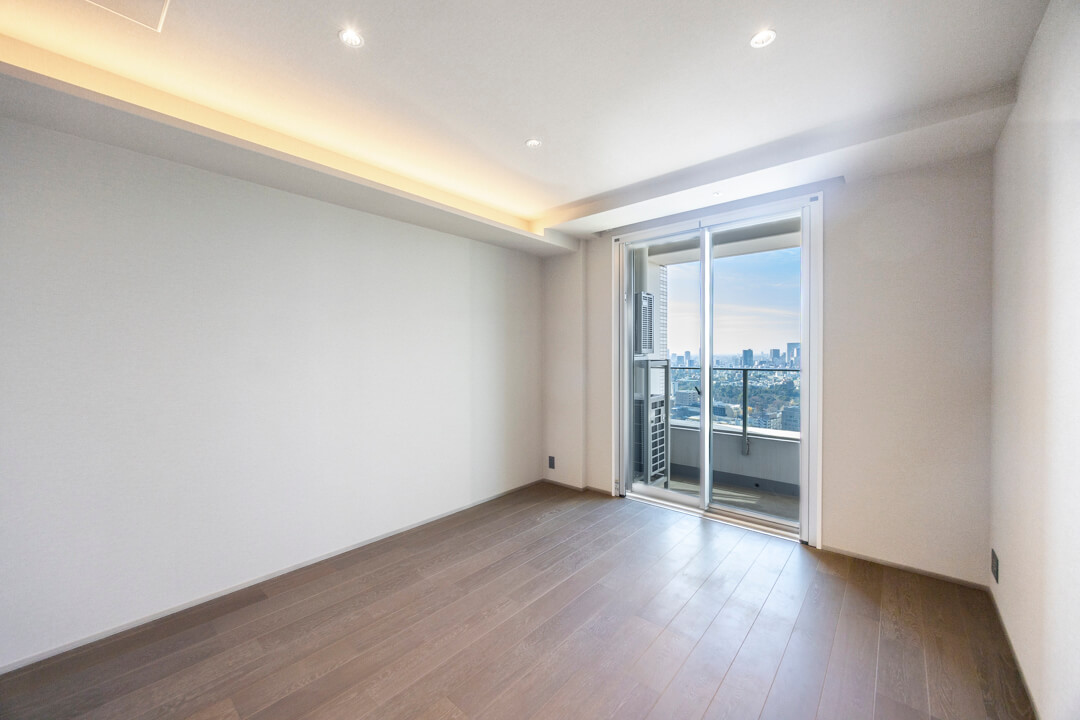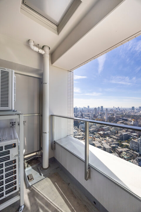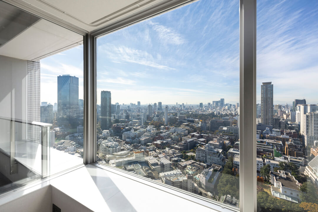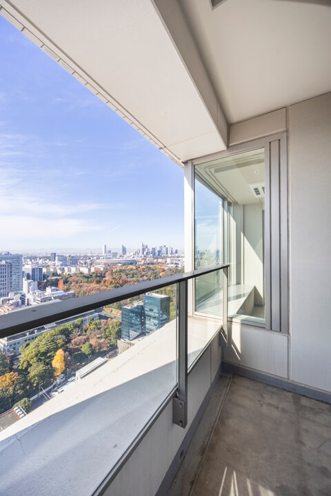 主寝室に面するバルコニー。33階南西向きのため、日当たり・眺望良好です。カナダ大使館や高橋是清翁記念公園の豊かな緑を望む、開放感溢れる眺めを堪能できますよ。遠く広がる青空とのコントラストも美しく、日々の暮らしに癒しをもたらしてくれます。