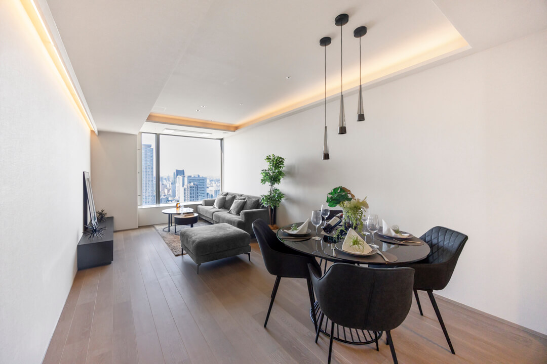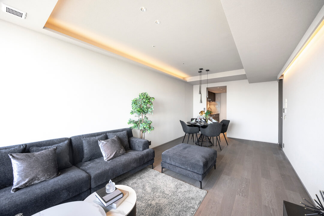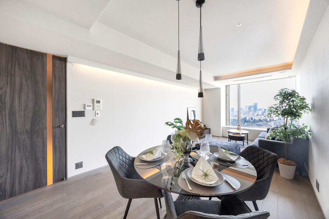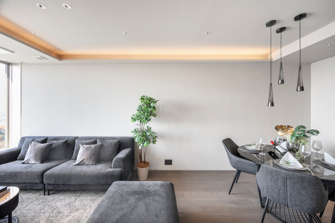 約14.9帖のリビングダイニング。南西向きで日当たり良好です。青空と豊かな緑を望む、開放的な眺めが魅力です。折り上げ天井&ビルトインエアコンが奥行きをもたらし、広々とした印象に。間接照明の明かりが心地よく、上質なリラックスタイムを演出します。