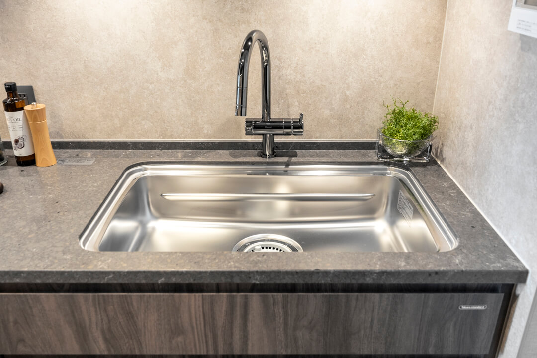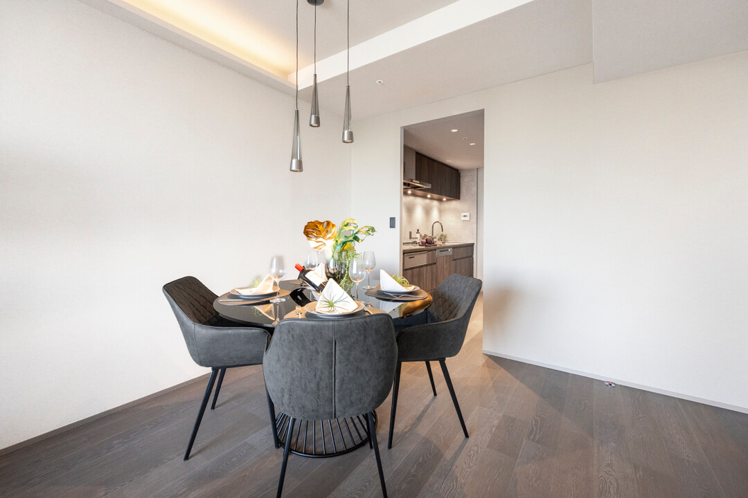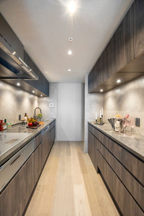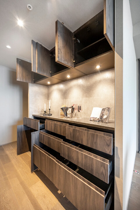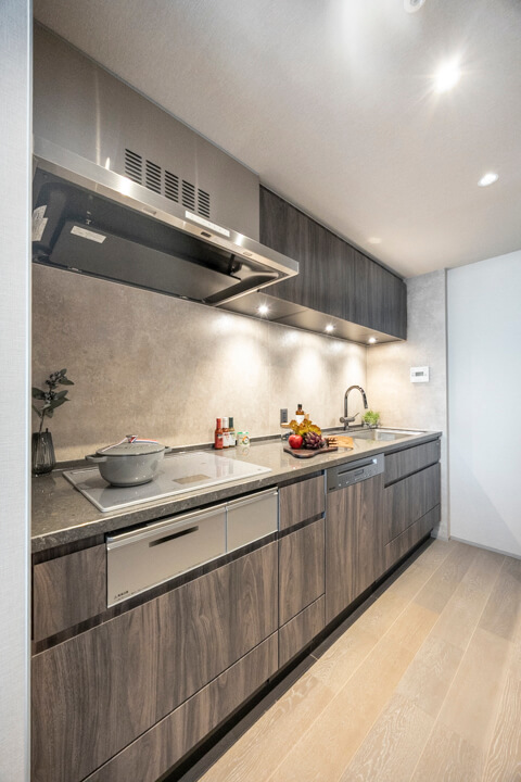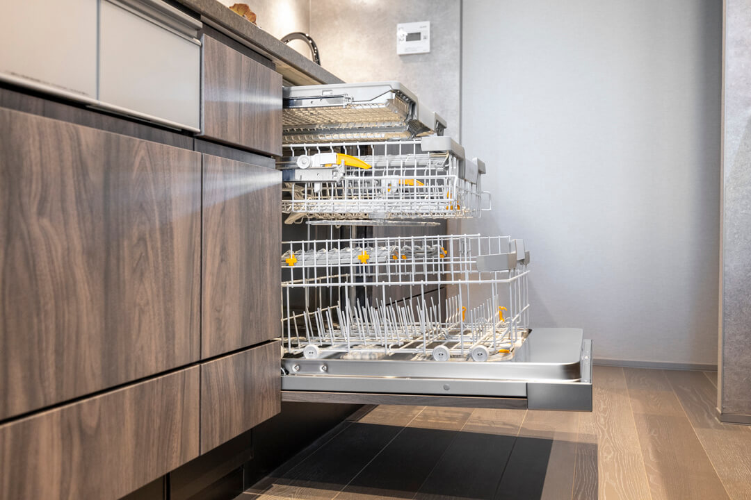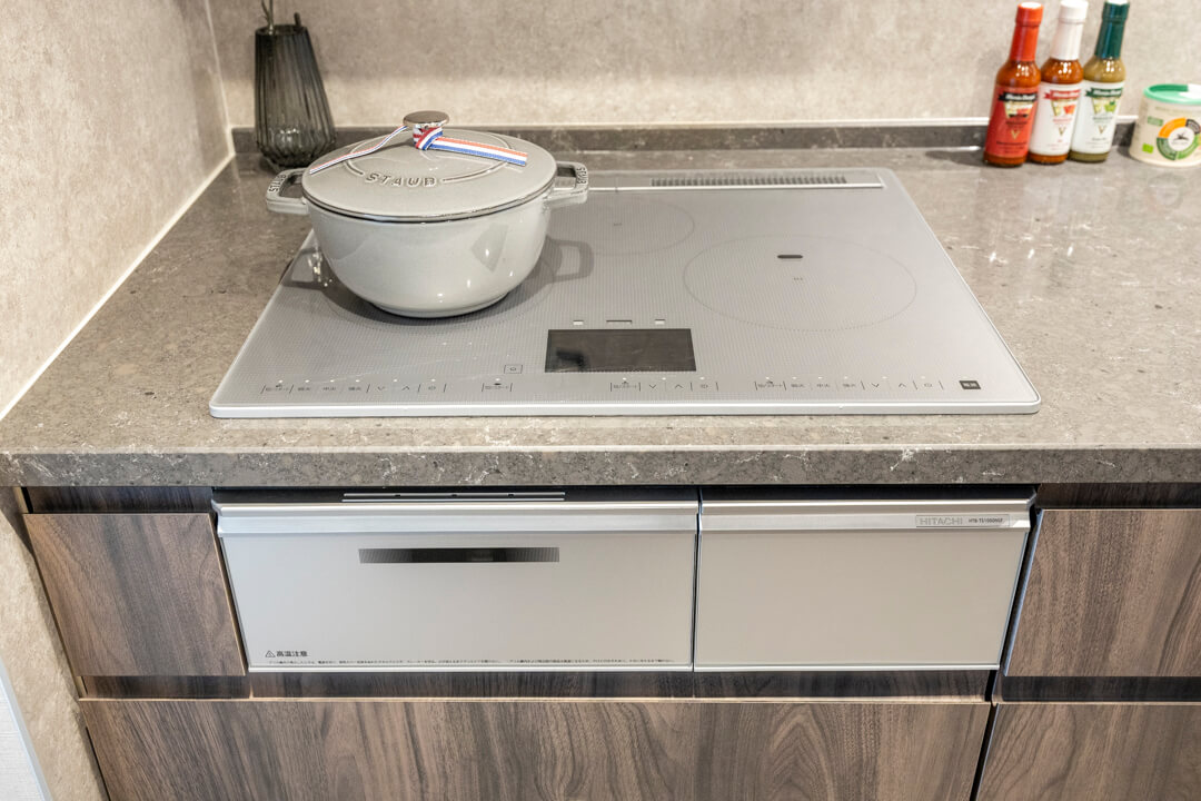 3口のIHクッキングヒーターやMiele(ミーレ)製の食洗機を完備。調理も後片付けも捗りそうですね。IHはスイッチで火力を調節でき、ガスコンロよりも調整が簡単。凹凸がなくフラットでお手入れがしやすいのも魅力的です。ディスポーザーも搭載されているので、掃除の手間が軽減され、悪臭の原因を防いでくれますよ。
