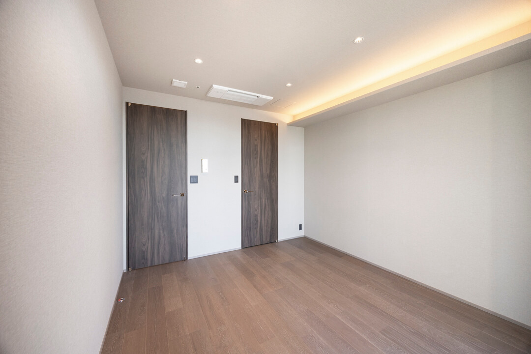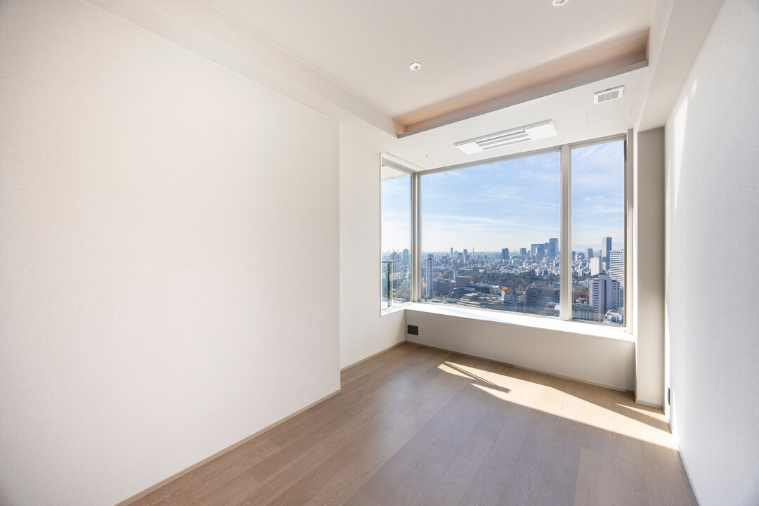 約7.4帖の寝室。コーナー窓から明るい光が降り注ぎます。高層階ならではの開放的な眺望も魅力ですね。折り上げ天井&ビルトインエアコンを採用し、すっきりとした印象に。WIC(ウォークインクローゼット)完備で収納スペースも充実しています。衣類はもちろん、トランクケースやゴルフバッグといった大きな荷物も収納でき、居室空間を広々と使うことができます。