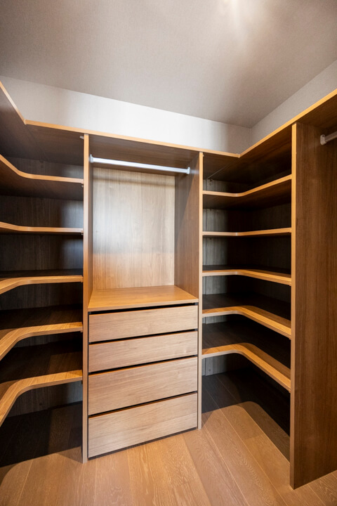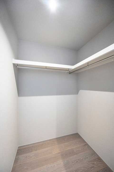 WIC(ウォークインクローゼット)完備で収納力◎。中にはハンガーパイプと可動棚、引き出しが設置されています。洋服はもちろん、鞄や靴下などの小物も整理整頓しやすいですね。すっきり収納し、居室空間を有効活用できそうです。