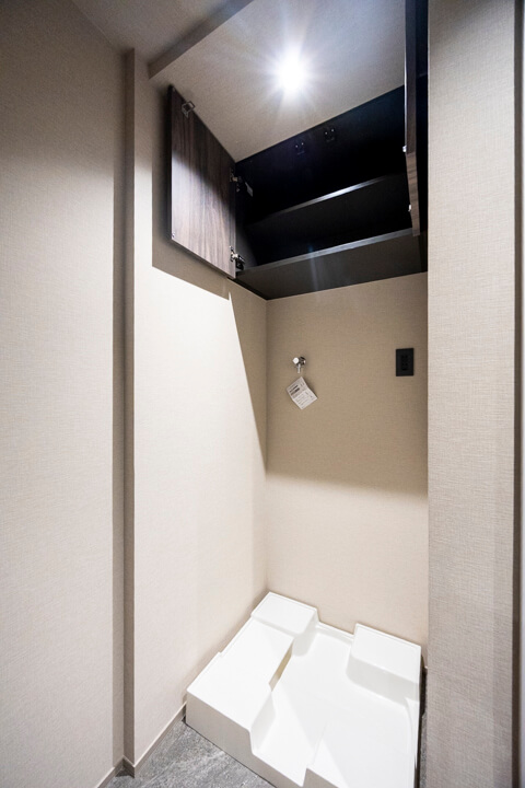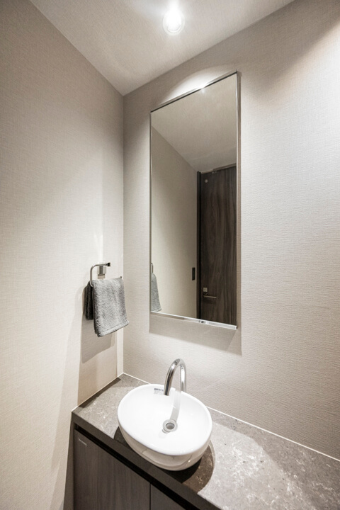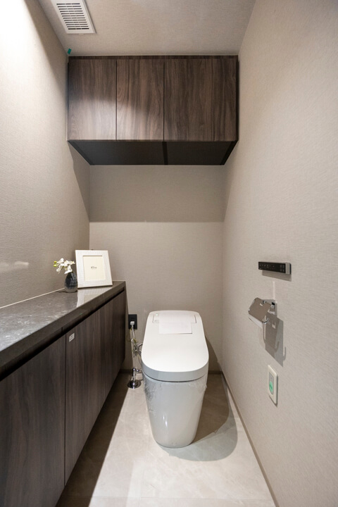 廊下に面していて独立性の高いレストルーム。Panasonic製の洗浄機能付トイレに交換済みです。タンクレス仕様でスタイリッシュですね。ホテルライクな手洗いカウンター付きで、すぐに手を洗うことができ、ゲストを洗面室まで案内する手間もかかりません。トイレットペーパーや掃除用品は吊戸棚に収納可能です。