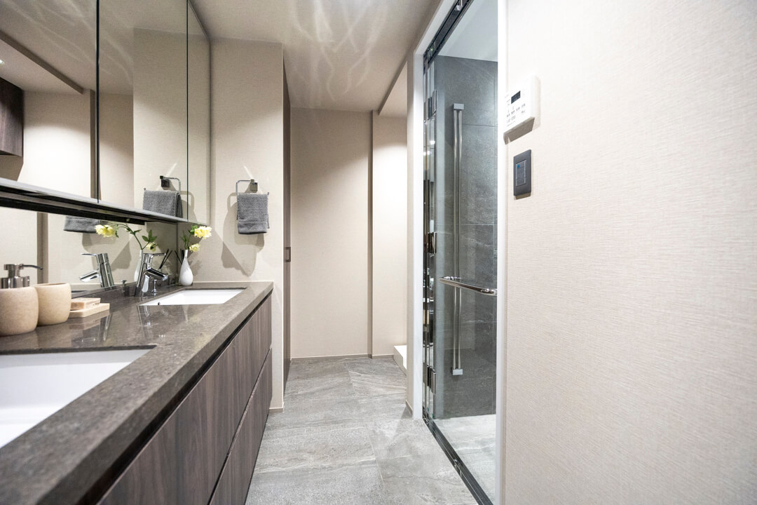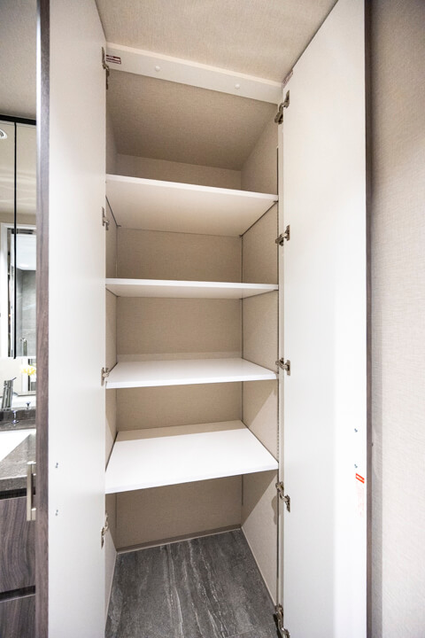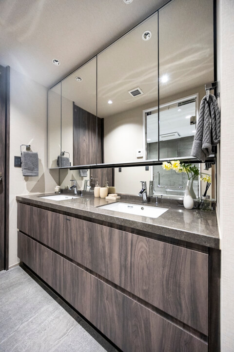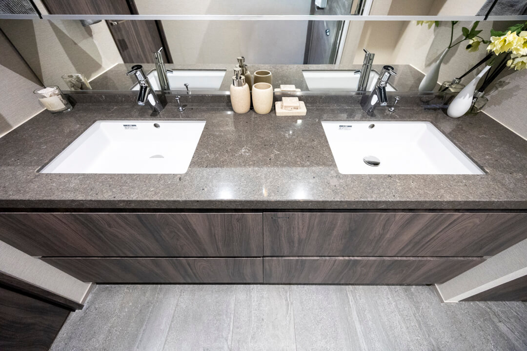 ホテルライクな2ボウル仕様の洗面化粧台。2人同時に使用でき、忙しい朝の身支度も安心です。カウンタースペースにゆとりがあり、化粧品やドライヤーの仮置きができるのも嬉しいですね。洗面台本体の収納に加え、大容量のリネン庫もあって収納豊富◎。タオルやパジャマもすっきり収納できます。