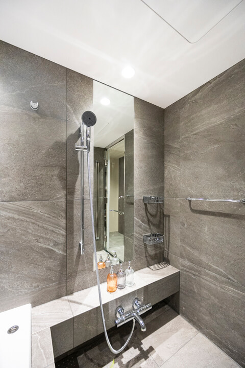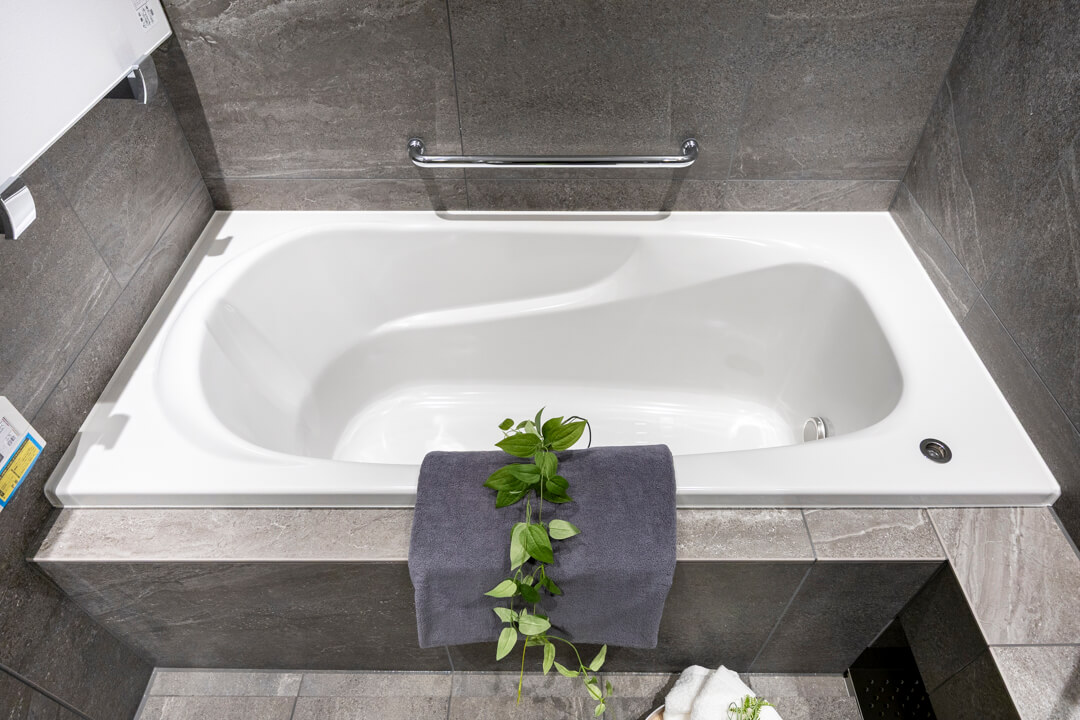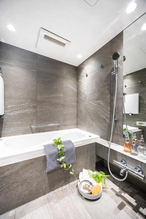 石調デザインで高級感の漂うバスルーム。換気・暖房・乾燥・涼風機能付きで1年中快適なバスタイムをお過ごしいただけます。カビ対策や雨の日のお洗濯にも便利ですね。丸みを帯びた浴槽が身体を包み込み、1日の疲れを癒せそうです。