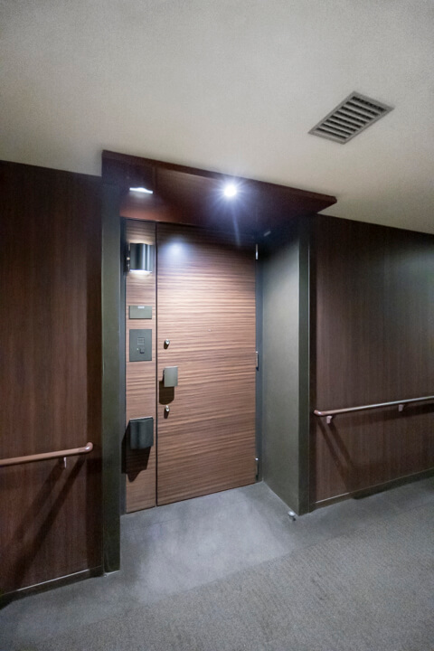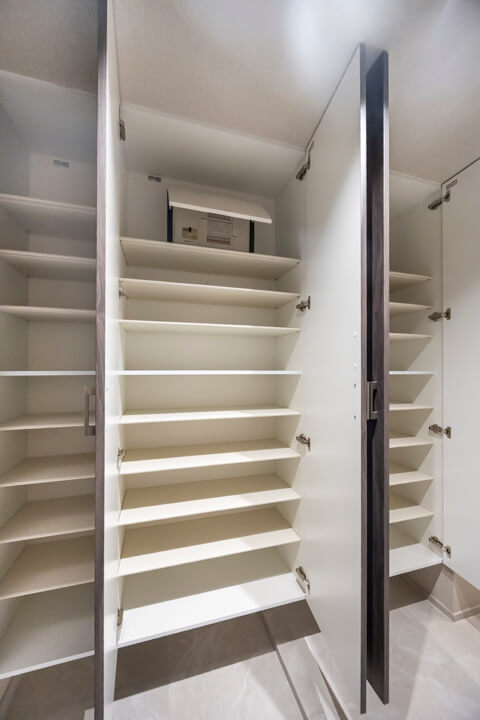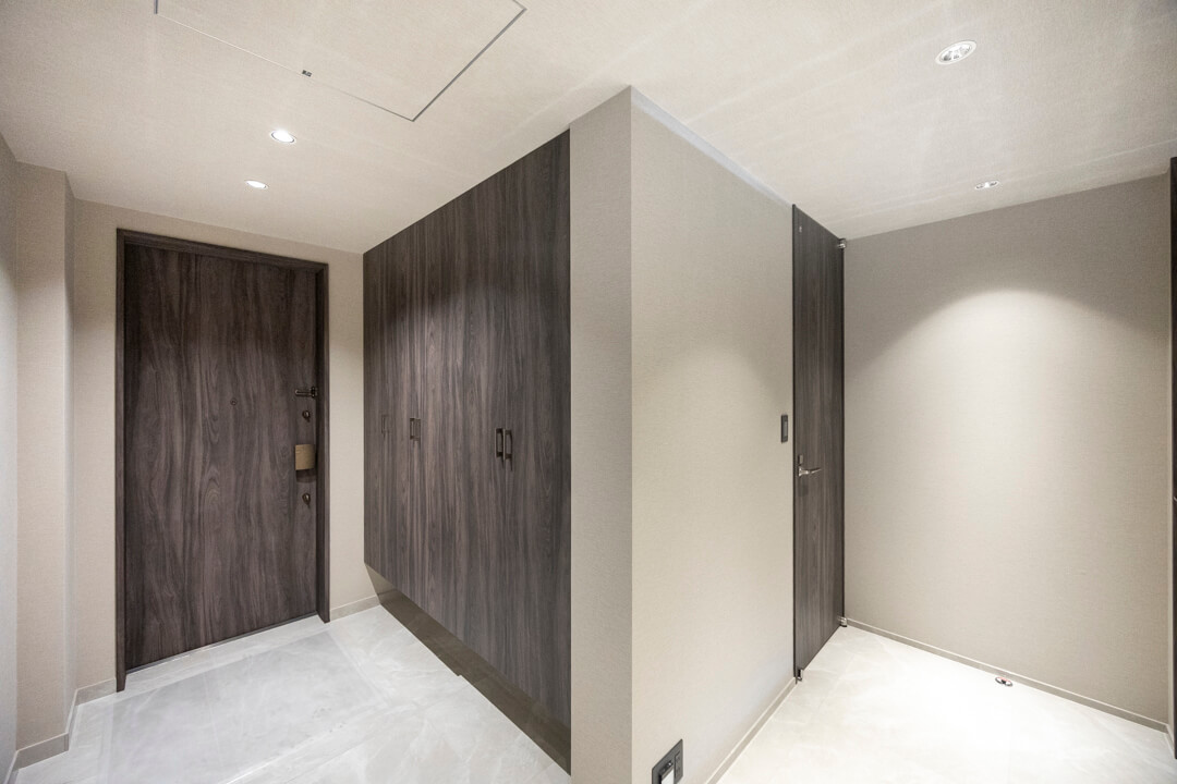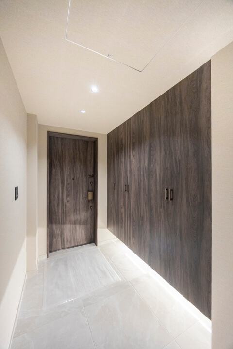 フットライトの明かりが足元を幻想的に包み込む玄関。大容量のシューズボックス完備で、いつも清潔な空間をキープできます。自由度の高い可動棚で、ロングブーツやレインシューズもすっきり収納できますよ。照明は人感センサー付きなので、荷物で両手が塞がっている時や夜遅く帰宅した時に、スイッチを探す手間がかからず助かります。