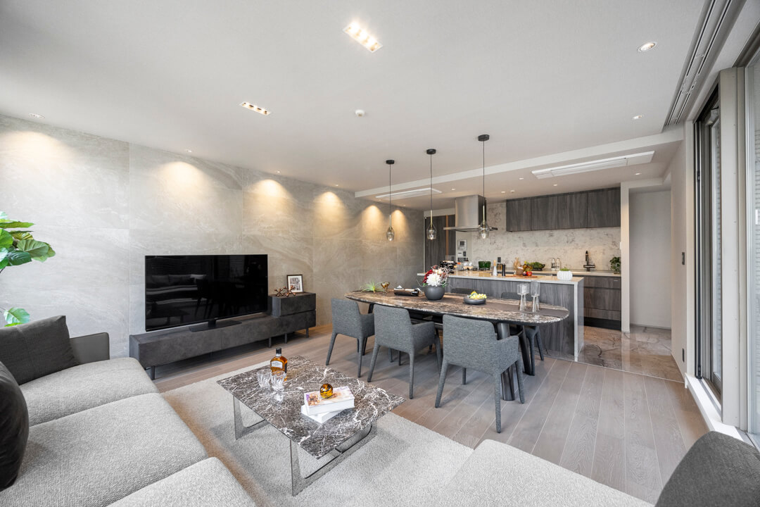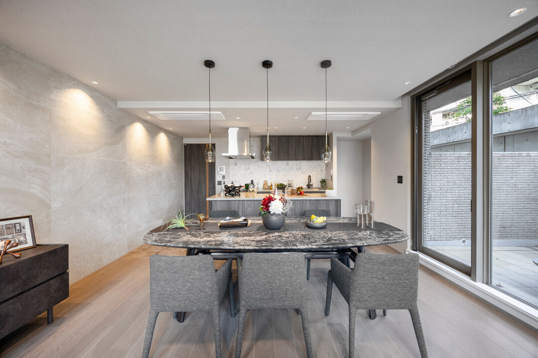 約22.2帖の広々としたリビングダイニングキッチンです。二面採光で開放感があり、窓からはテラスにアクセスができます。壁面はストーン調で、お部屋を上品な雰囲気に演出してくれています。また、エアコンは埋め込み式のため、インテリアの邪魔をしないのも◎。