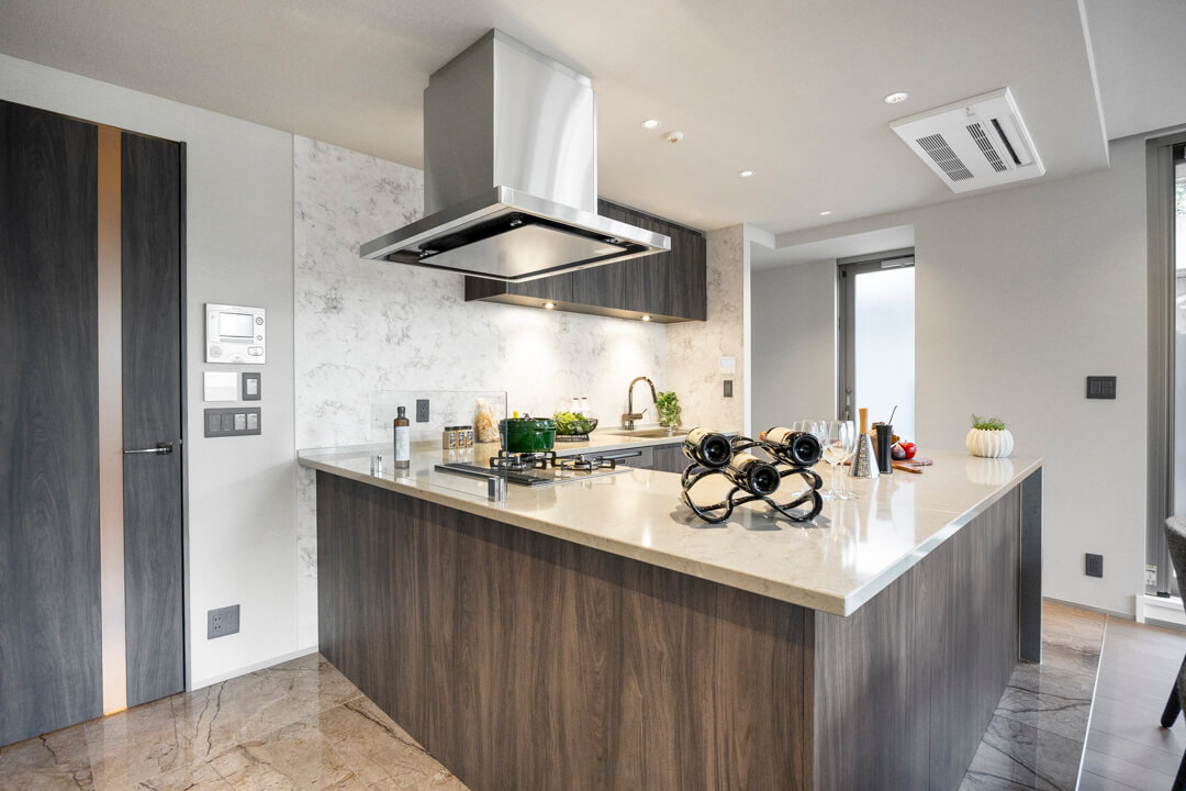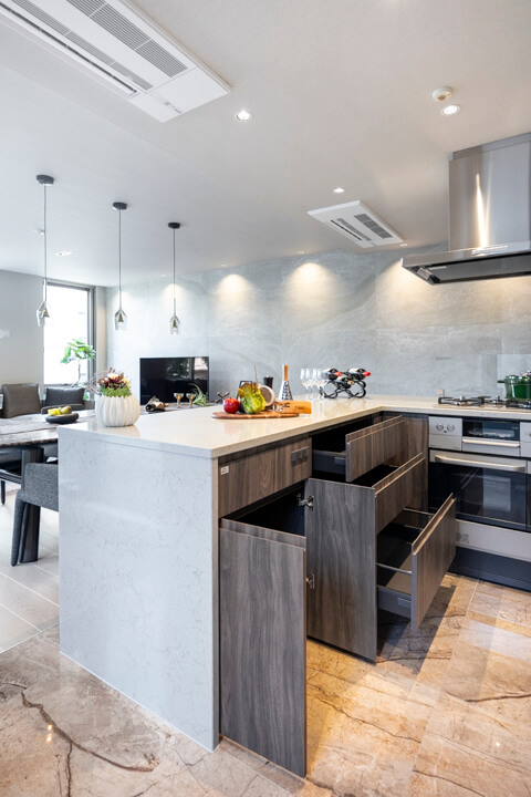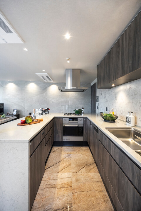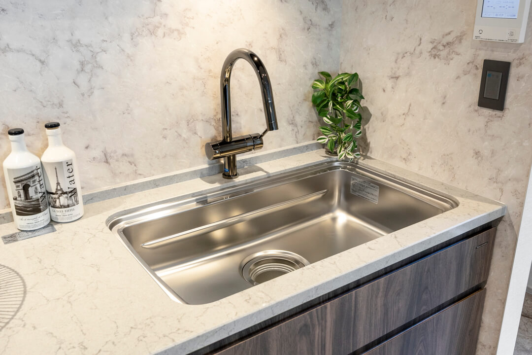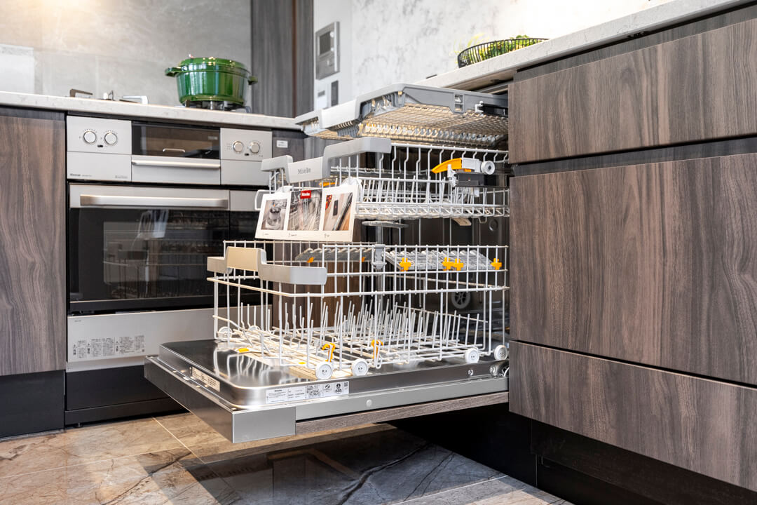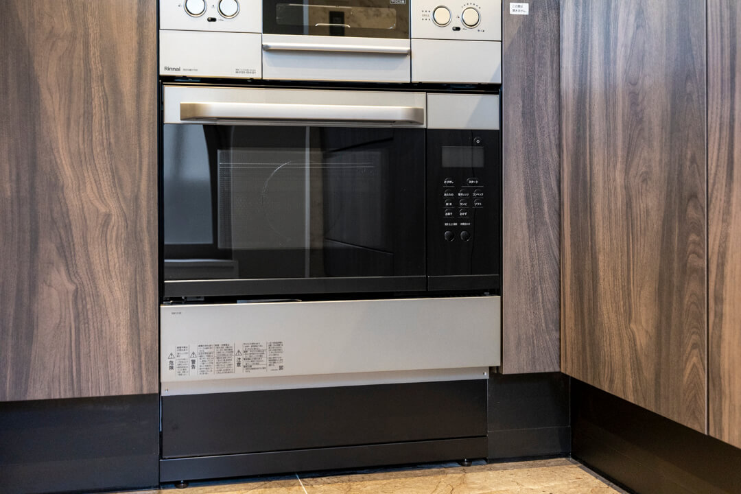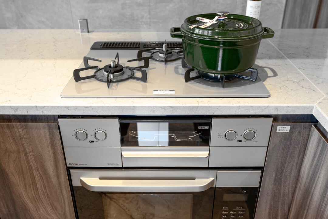 3口コンロ、グリル、オーブン食洗機付きと設備面も充実しています。シンクも広々としているので野菜などが洗いやすそうですよ。食洗機は、ドイツの高級家電メーカーミーレ製の大型食洗機を採用しています。