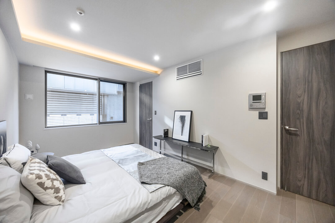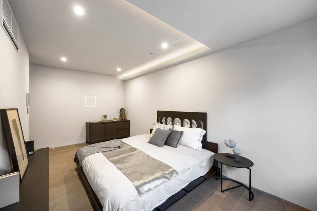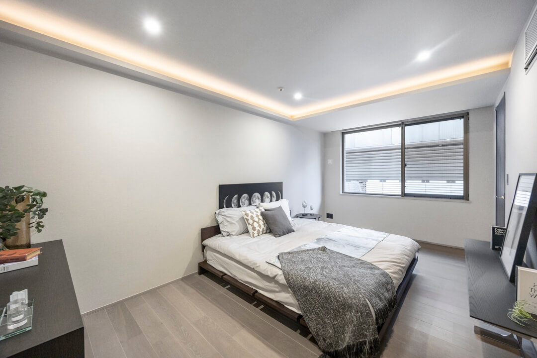 約10.1帖の広々とした主寝室は、天井に間接照明があしらわれていて、くつろぎ空間となっています。大きめのベッドなども配置できそうで、ゆったりと過ごすことができそうです。また、奥行きがあるウォークインクローゼットが造られており、たくさんの洋服なども収納することができます。