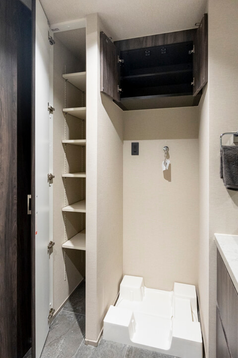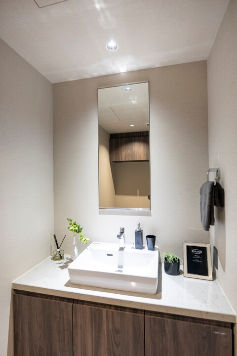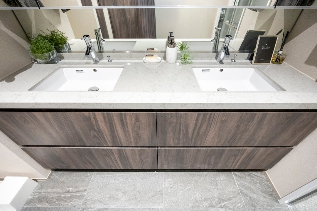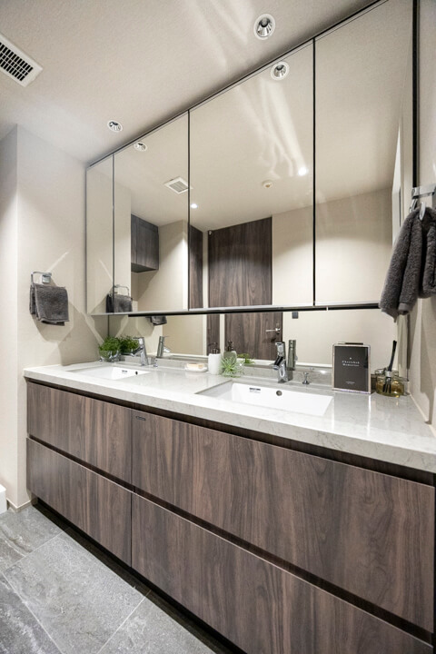 ホテルライクな2ボウル洗面の化粧台です。忙しい朝でも並んで支度ができるので嬉しいですね。大きなミラーボックスの中には化粧品などが収納できて使い勝手良好。また、入口付近にはリネン庫が造られているので、ごちゃごちゃしがちな洗面まわりもきちんと整頓できます。