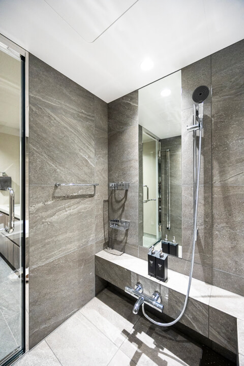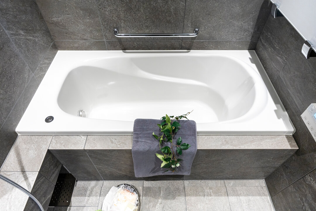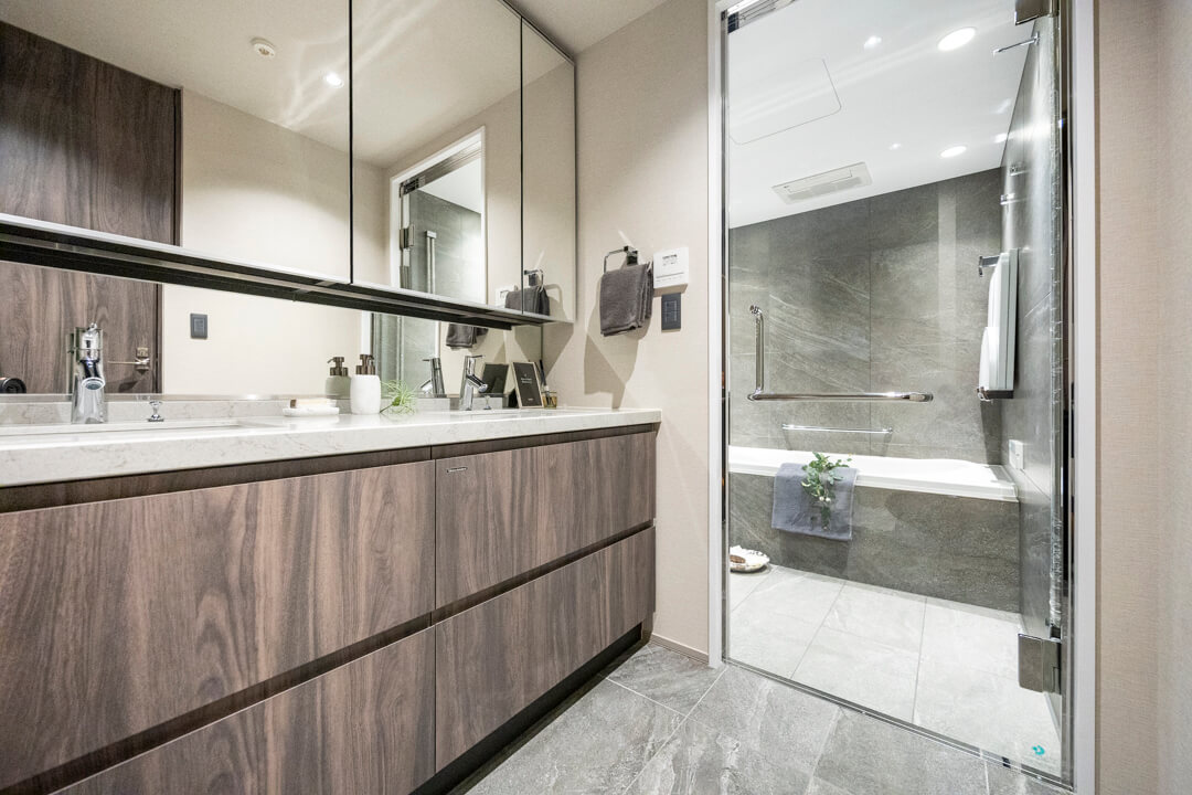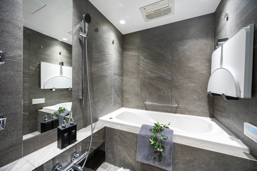 重厚感が漂うバスルームです。お風呂にゆっくり浸かるのが好きという方に嬉しい追い焚き機能を搭載。家族の入浴時間がずれてしまっても安心です。また、浴室乾燥機には暖房・乾燥・換気・涼風の機能がついており、一年中快適に過ごすことができます。