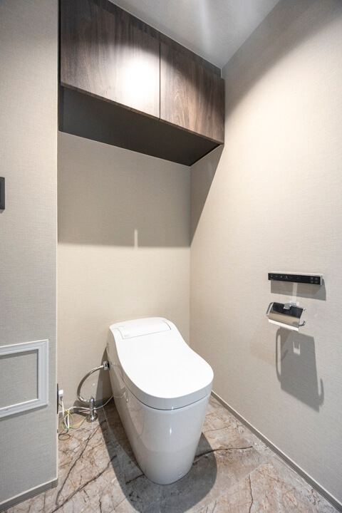 ウォシュレット一体型のトイレです。タンクレスタイプなのですっきりとした印象に。また、別途で手洗い器と鏡が造られているので、その場でサッと身だしなみを整えることができます。上部には吊戸棚が設置されていて、収納スペースもありますよ。