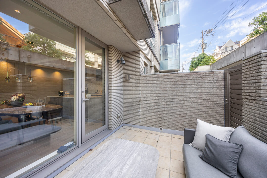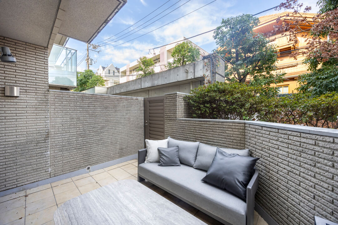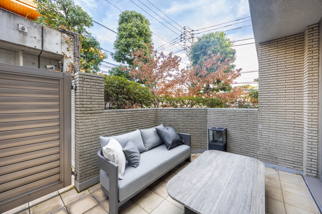 約10.30㎡のゆとりがあるテラスです。背の高い植栽などのおかげで、2階ですが周りからの視線は気になりにくくなっています。テーブルセットを置いてティータイムを楽しんでも◎。