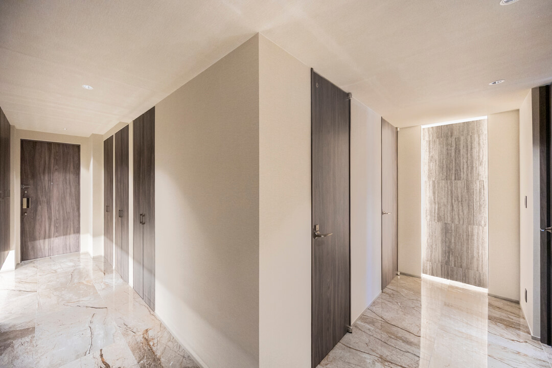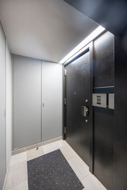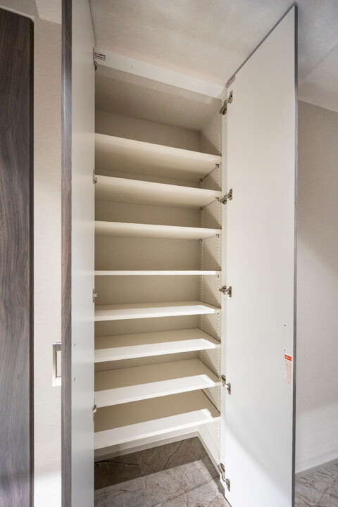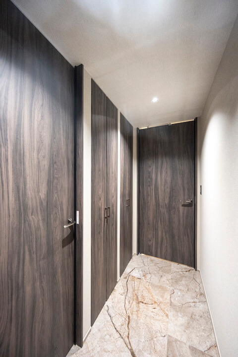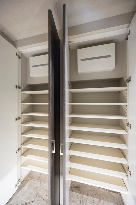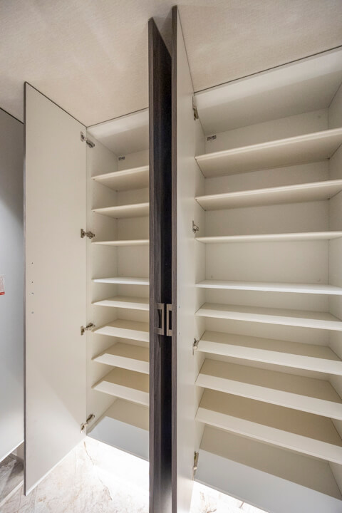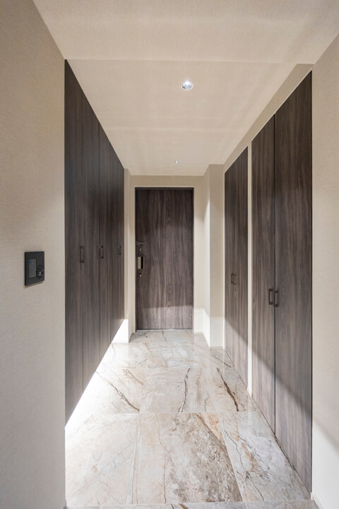 高級感のある玄関には両サイドにシューズボックスが備え付けられています。たくさんの靴が収納できるので、生活感を隠してお客様をお出迎えすることができますよ。また、廊下にも収納スペースが豊富に造られています。