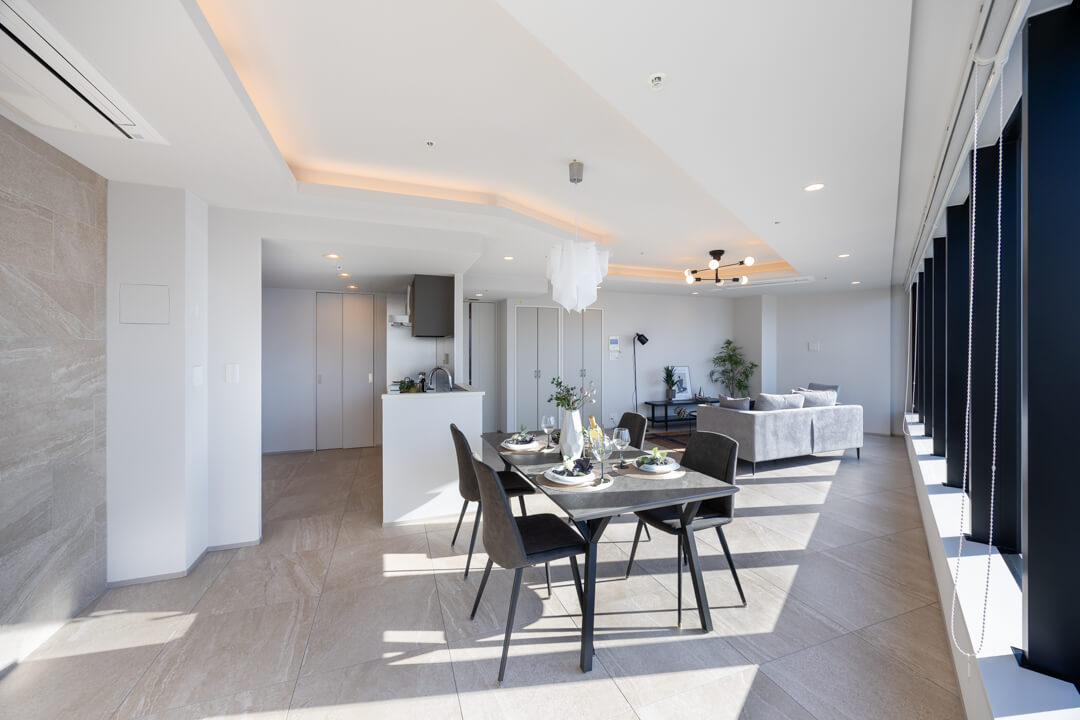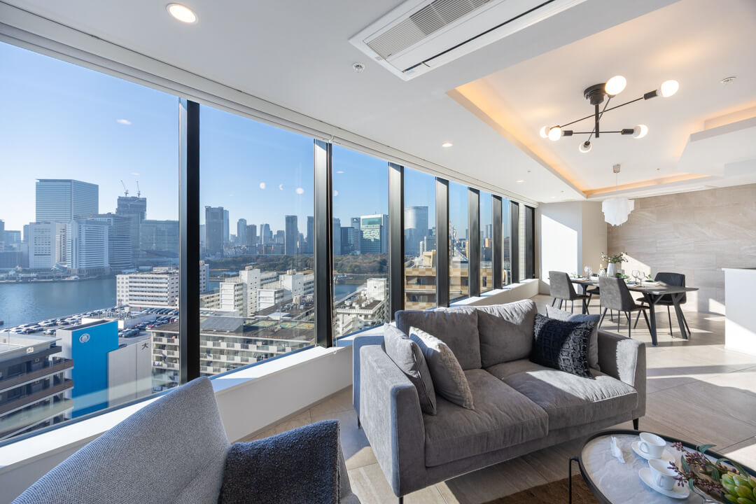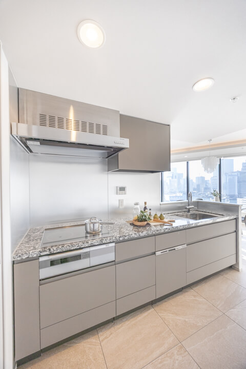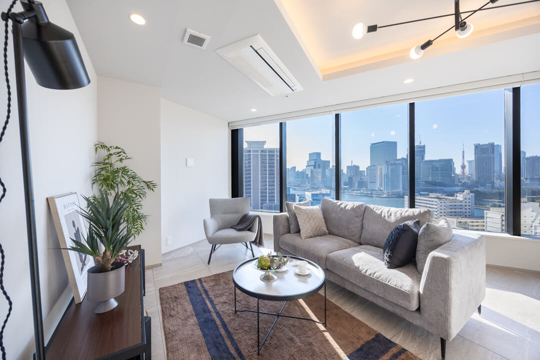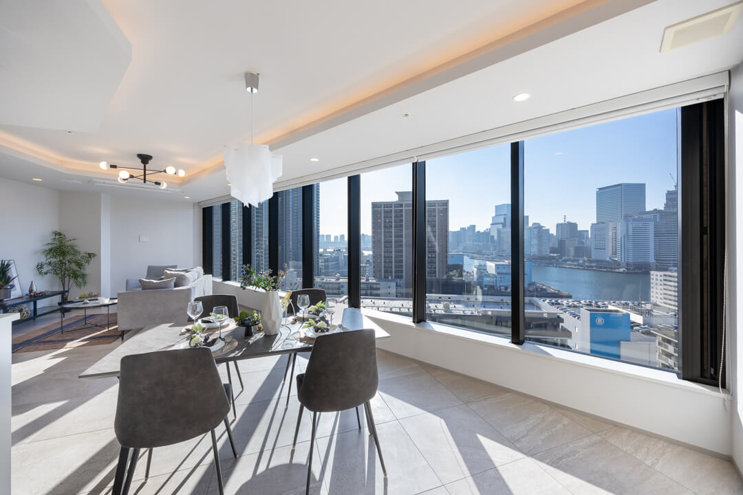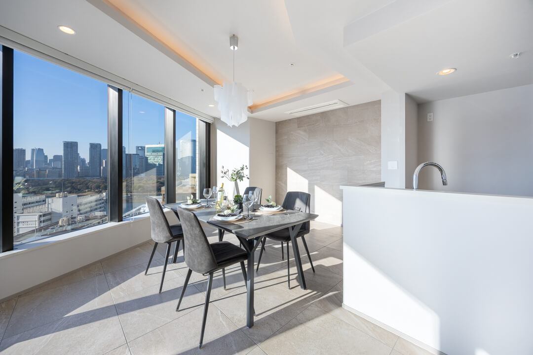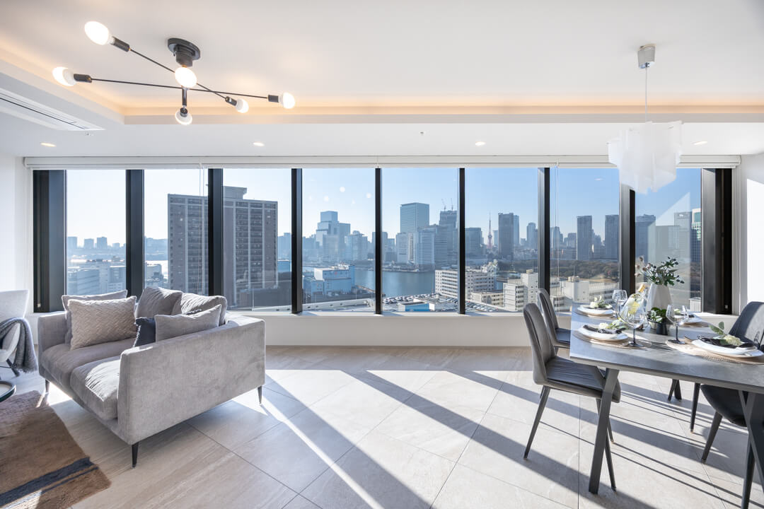 約16.8帖の広々としたリビングダイニングキッチンは、窓に囲まれた開放感溢れる空間となっています。窓からは運河越しに東京タワーや浜離宮恩賜庭園が望め、都心とは思えないラグジュアリーな景観が堪能できます。