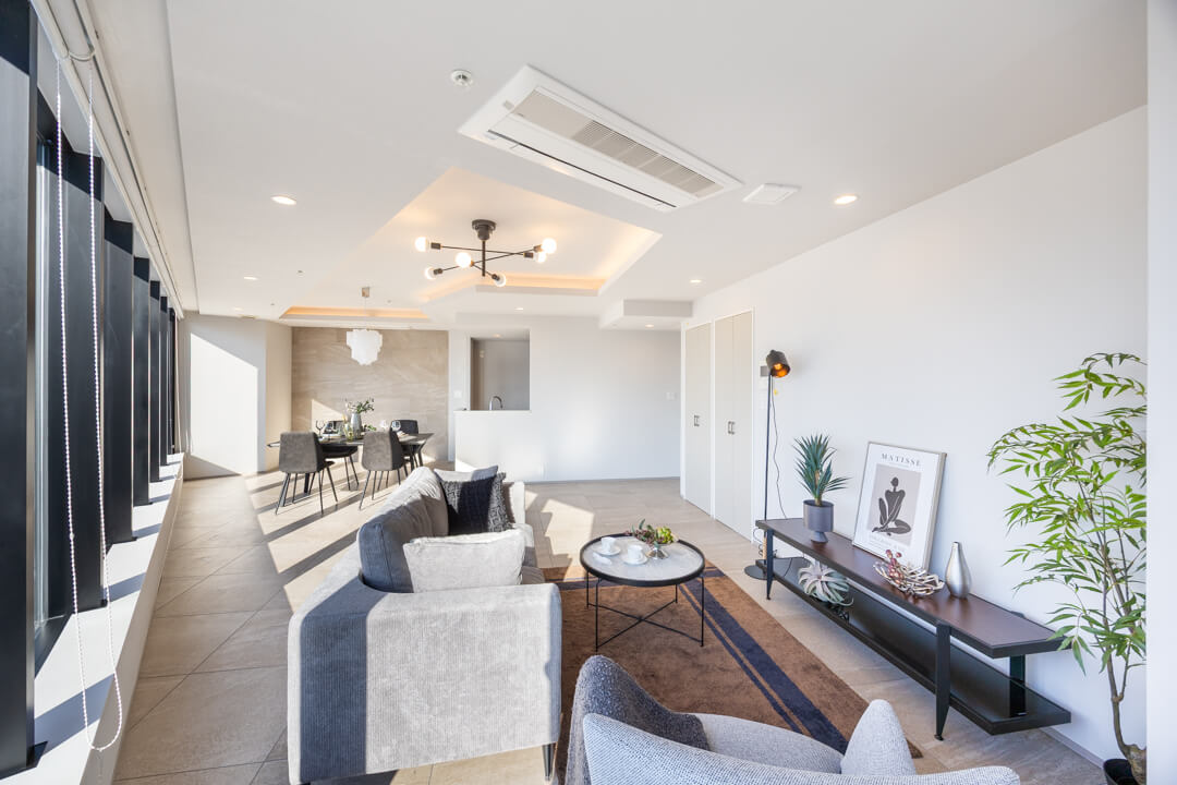 天井には間接照明、壁面にはアクセントタイルがあしらわれていて、お部屋を上品な雰囲気に演出してくれています。エアコンも埋め込み式のため、インテリアの邪魔をしません。