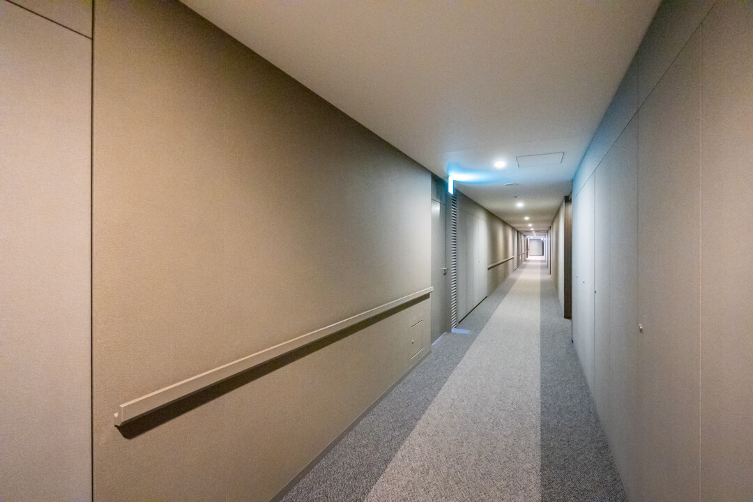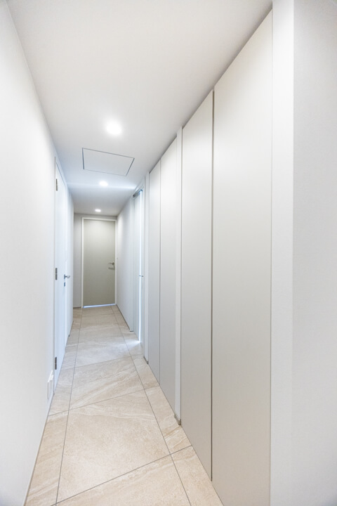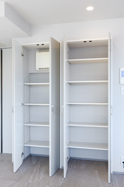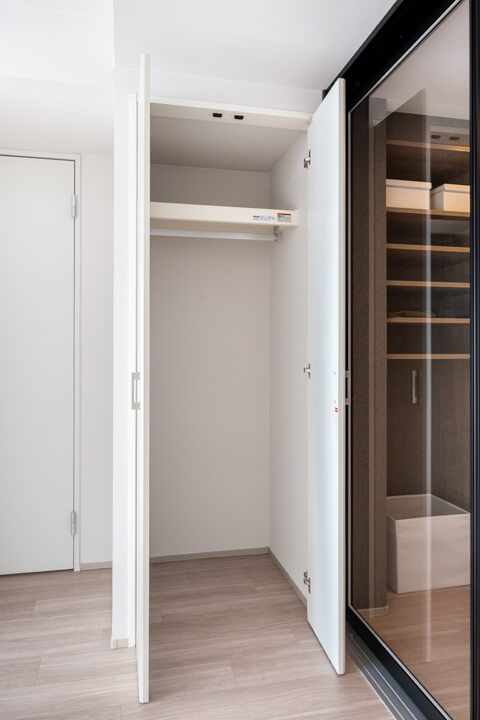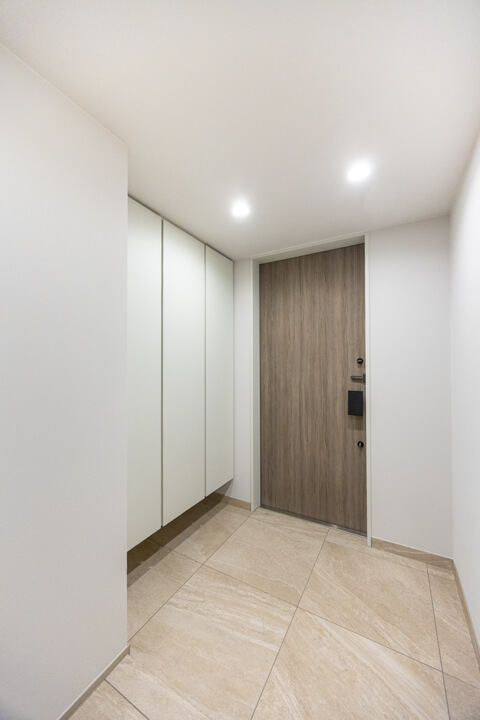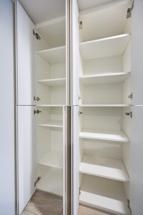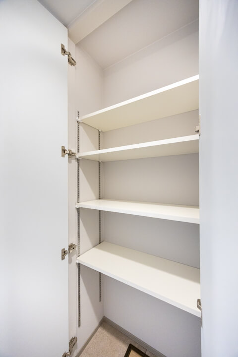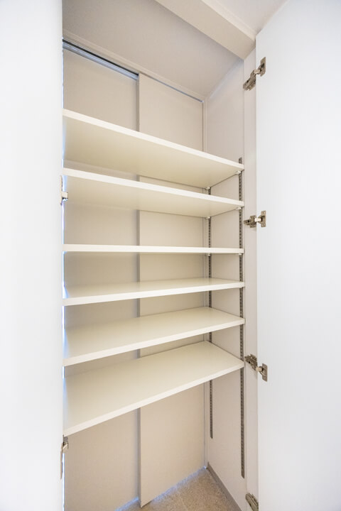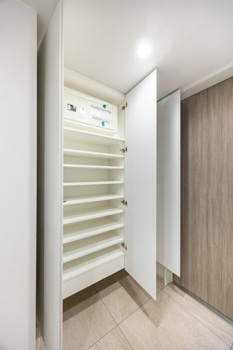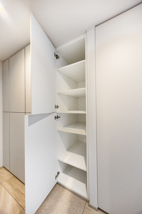 玄関入って右側にはシューズボックスが備え付けられています。高さがありますが、フロートタイプのため空間に圧迫感を与えません。中には可動棚が設置されているので、持っている靴に合わせて調節することができますよ。また、廊下には収納棚が2つも造られています。