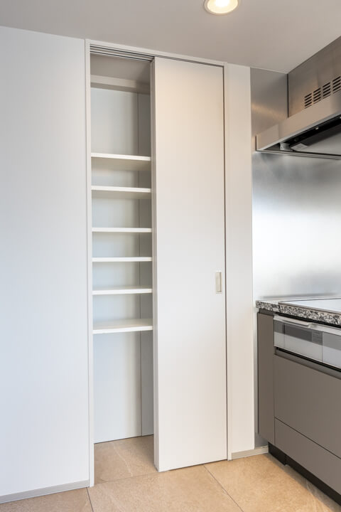 キッチン奥には棚が造られているので、調味料やストック類などを収納することができます。