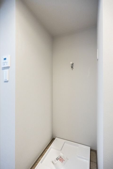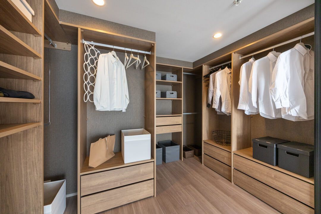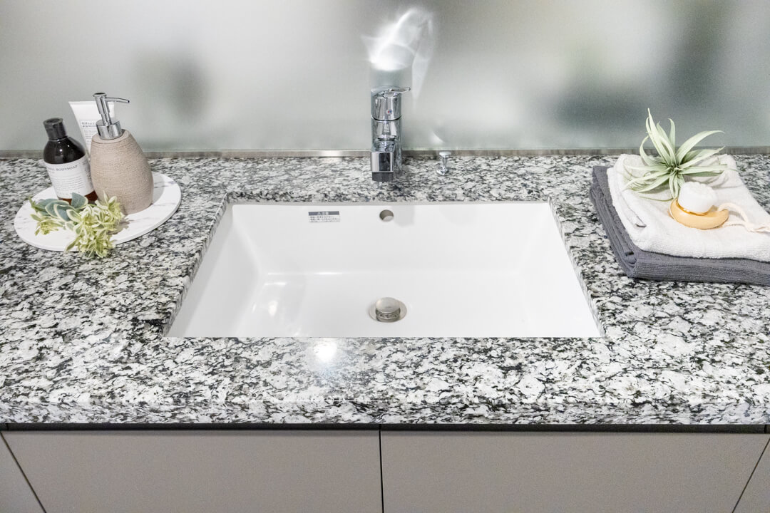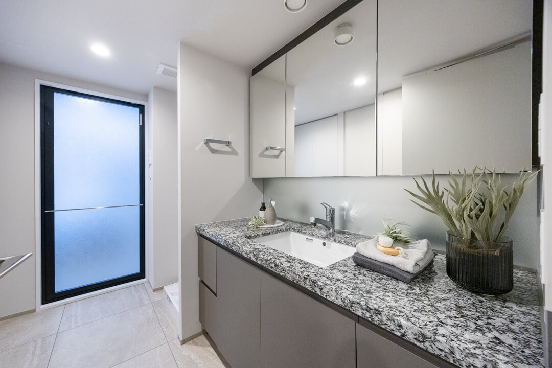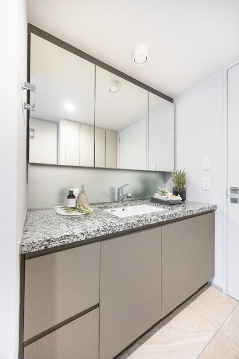 石目調のカウンターが高級感をもたらしている洗面化粧台です。広めのカウンターで身支度もしやすくなっています。大きな三面鏡の中には化粧品などが収納できて使い勝手良好。背面側にはリネン庫が2つも造られているので、ごちゃごちゃしがちな洗面まわりもきちんと整頓できそうです。