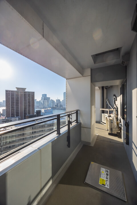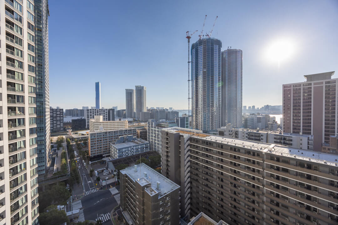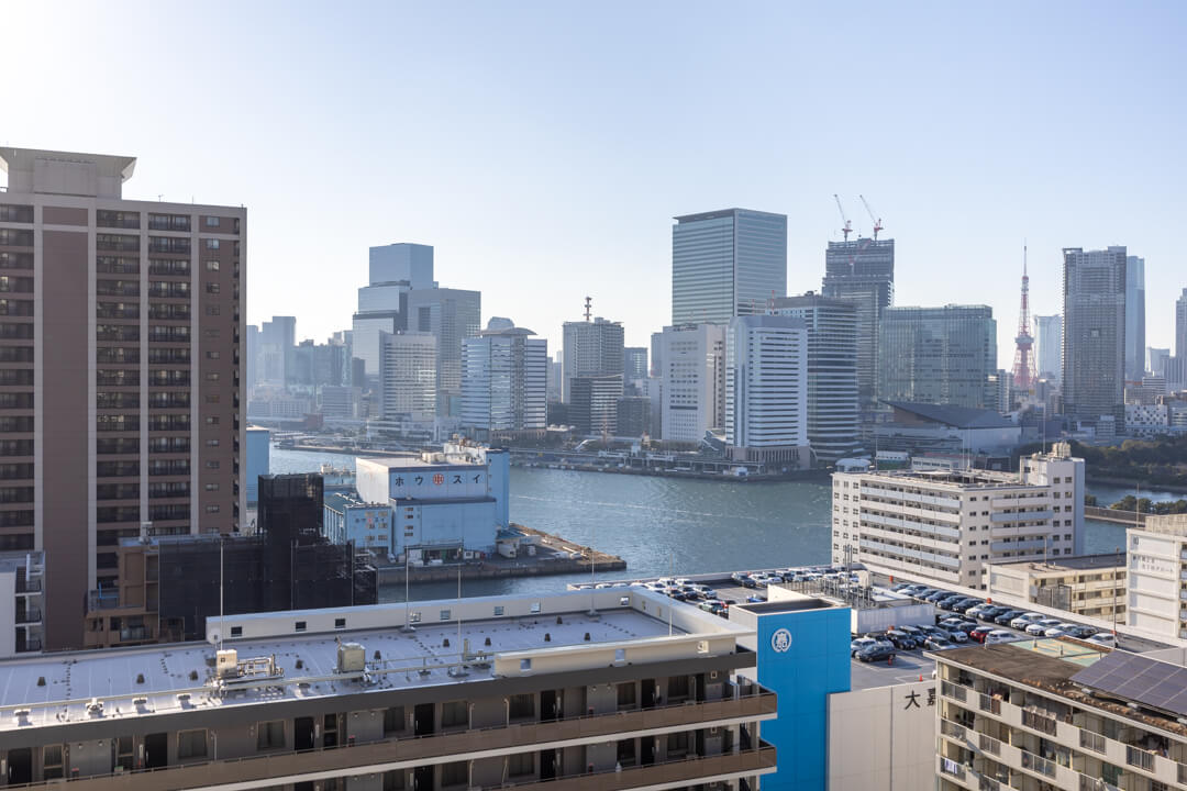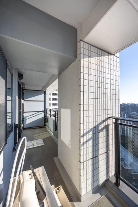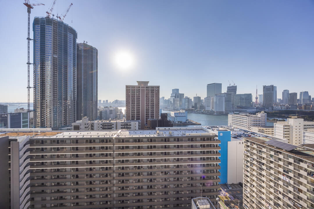 約12.13㎡のゆったりとしたバルコニーです。南西向きのため日当たりが良好。18階部分のため、目の前には運河やビル群を望む抜け感のある眺望が広がっています。東京タワーも顔を出し、きらめきをプラスしてくれますよ。