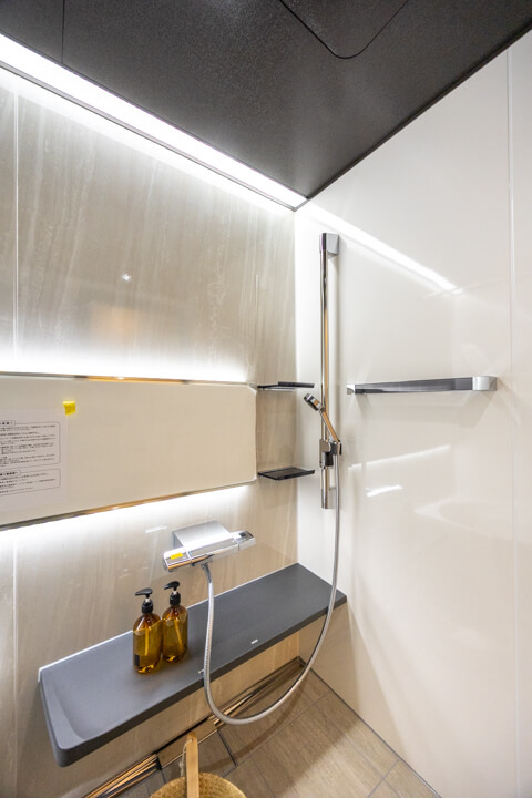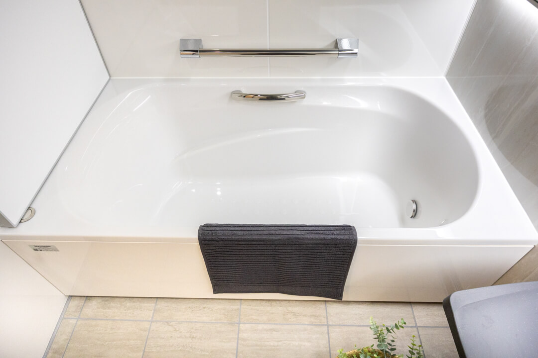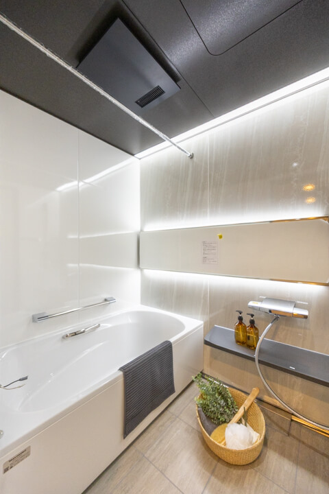 1418サイズのバスルームは、上質な雰囲気が漂っています。浴室乾燥機には暖房・乾燥・換気・涼風の機能がついており、一年中快適に過ごすことができます。浴槽側には手摺が設置されているので、立ち上がりもしやすくなっていますよ。