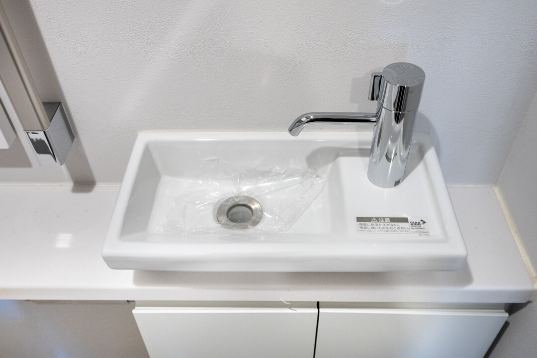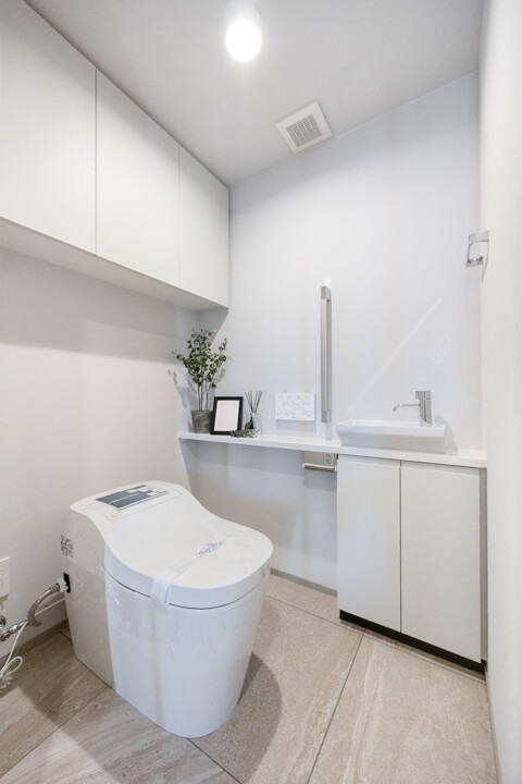 ウォシュレット一体型のトイレです。タンクレスタイプなのですっきりとした印象に。また、別途で手洗い器が造られているので、すぐに手を洗うことができて衛生的です。上部には吊戸棚が設置されていて、収納スペースもありますよ。カウンタースペースにはアロマなどを置いても◎。