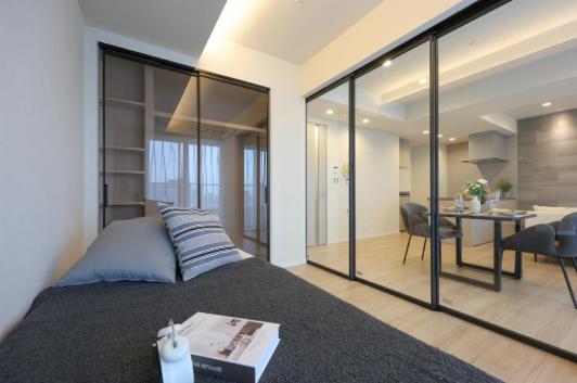 約4.8帖の寝室はリビングダイニングキッチンに隣接しています。コンパクトなお部屋ですが、ガラス扉を採用しているので空間に広がりを感じます。収納力◎なクローゼット付きで、洋服や小物もすっきりと収納が可能です。