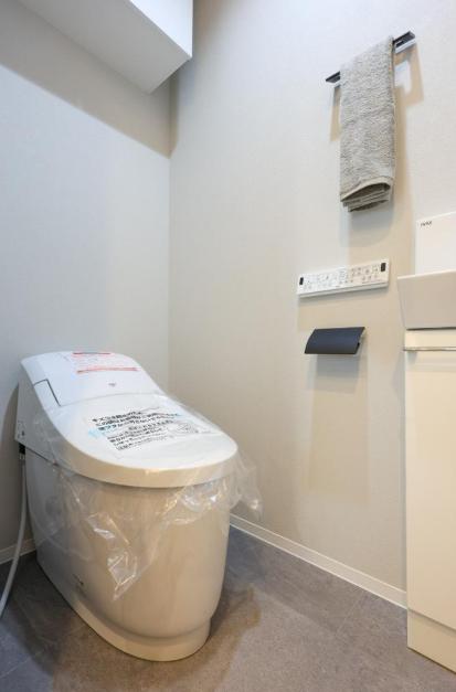 ウォシュレット一体型のトイレです。タンクレスタイプなのですっきりとした印象に。また、別途で手洗い器が造られているので、すぐに手を洗うことができて衛生的です。上部には吊戸棚が設置されていて、収納スペースもありますよ。
