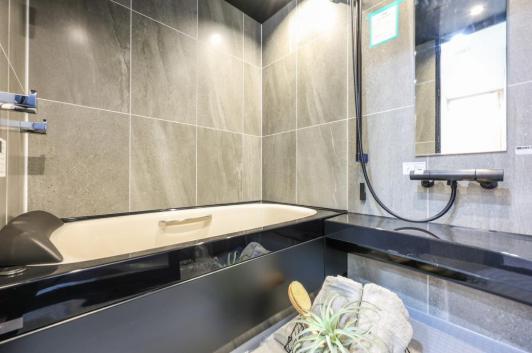 ダークトーンでまとめられた重厚感のあるバスルームです。お風呂にゆっくり浸かるのが好きという方に嬉しい追い焚き機能を搭載。家族の入浴時間がずれてしまっても安心です。また、浴室換気乾燥機付きのため雨の日の洗濯物にも困りません。浴槽にはヘッドレストが設置されているので、優しく首元を支えてくれます。