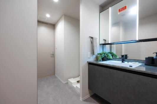 LIXIL製の洗面化粧台はスタイリッシュな印象。三面鏡の中には化粧品などが収納できて使い勝手も良好です。照明が縦に配置されているので、顔に影をつくらないのも◎。また、背面側には棚が造られているので、ごちゃごちゃしがちな洗面まわりもきちんと整頓できます。