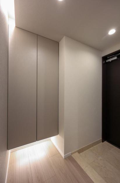 玄関入って右側にはシューズボックスが備え付けられています。高さがありますが、フロートタイプのため空間に圧迫感を与えません。フットライトの光が優しく足元を照らしてくれます。