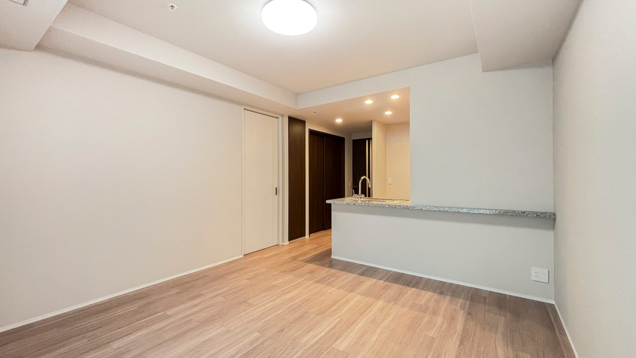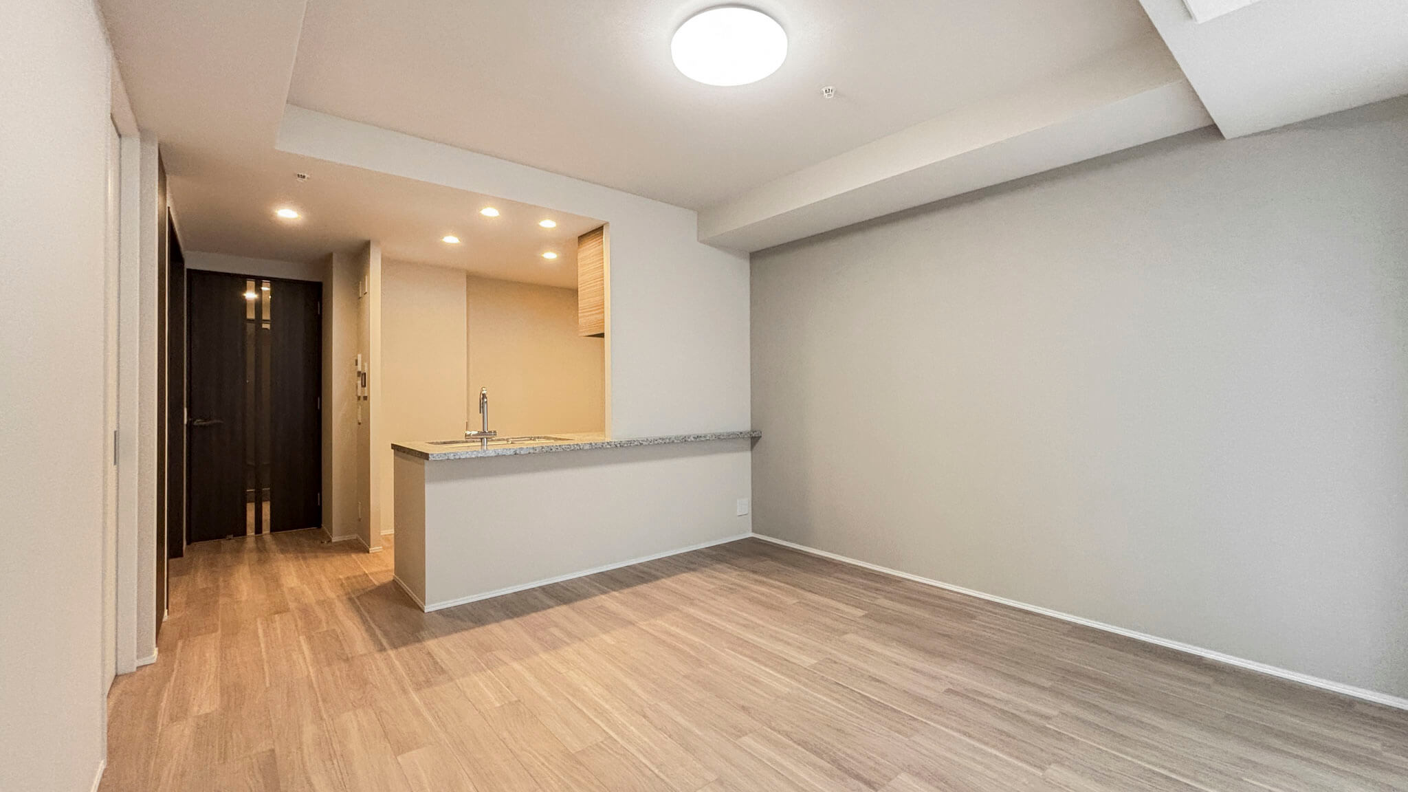 約13.4帖のLDK。南東向きの大きな窓から太陽光が降り注ぐ空間です。木目柄フローリングを採用した落ち着いた内装は、さまざまなテイストのインテリアと相性が良さそう。すっきりとした見た目のビルトインエアコン完備なのも嬉しいポイントです。
